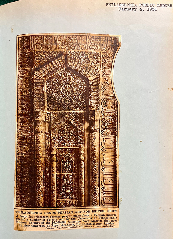 The mihrab’s exhibition at the Penn Museum overlaps with Philadelphia’s hosting of the First International Congress on Persian Art and Archaeology, orchestrated by Arthur Upham Pope in conjunction with the Sesquicentennial International Exposition (31 May–30 November). The exposition’s Persian Pavilion replicates and mixes aspects of Sassanian and Achaemenid architectural heritage, including the reliefs of Naqsh-e Rostam (map), as well as Safavid-period mosques in Esfahan like the Masjed-e Shah (map).146