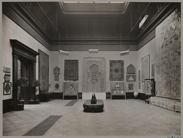 The mihrab is displayed for three and a half months in the Penn Museum’s “Exhibition of Mohammedan Art.” It is located at the far end of the exhibition in a stairway landing, elevated at the top of wooden steps, and placed in front of a black fabric in turn covering a door (fig. 97). Above the mihrab, more drapery covers a cast of the frieze of the Parthenon, part of the Classical galleries installed in 1899. The exhibition unfolds in the long gallery facing the mihrab, and the high ceilings accommodate several large carpets (fig. 98).
