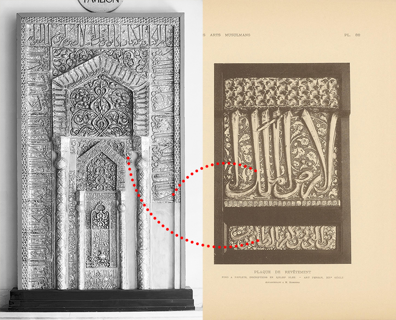 A comparison of the Penn Museum photograph to the one reproduced by Sarre in 1910 reveals that the mihrab had undergone some changes since entering Kevorkian’s possession (fig. 99). One notable change is the restoration of damaged areas visible in the older photograph, particularly along the outer border tiles. Some of the individual tiles are also rearranged. The three tiles comprising the bases of the large columns, with thin inscriptions along their edges, are altered, as are some of the thinner tiles framing the inner niche, which had already been disrupted in 1910.