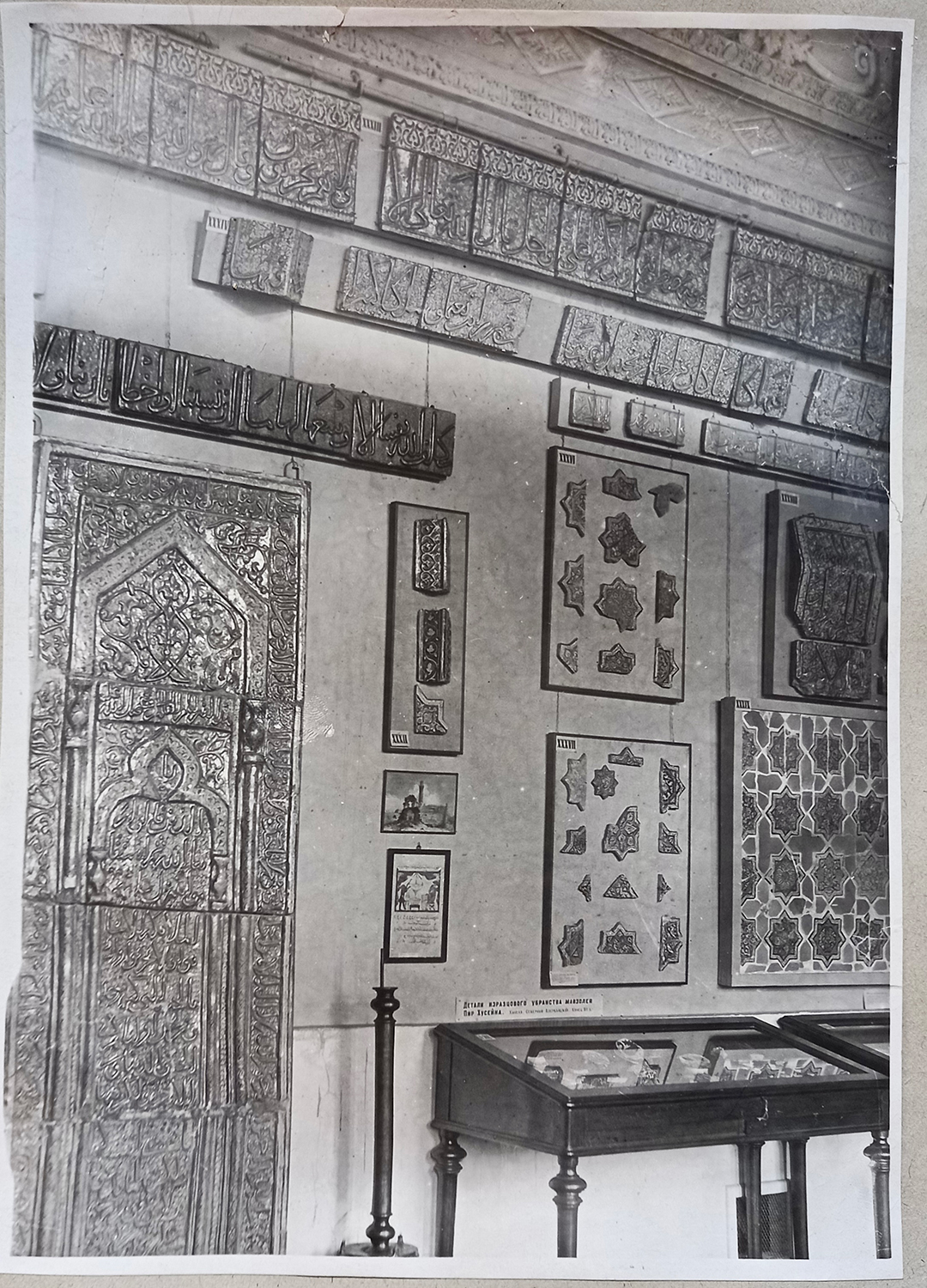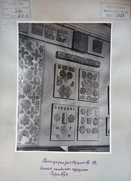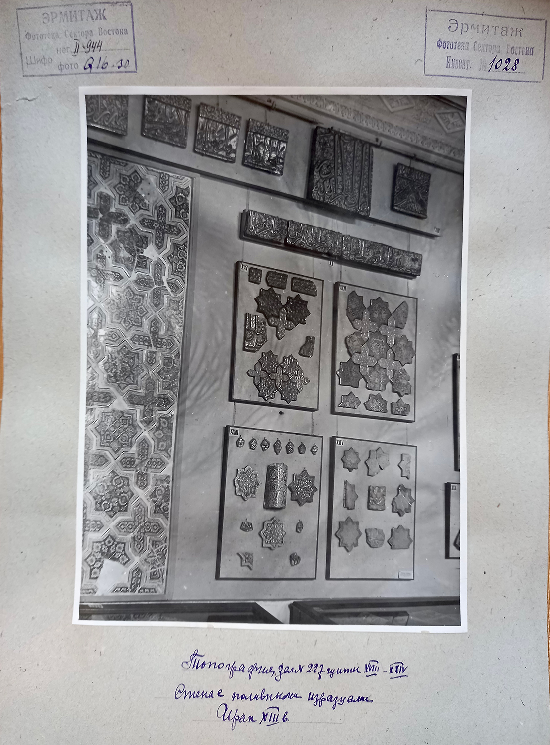 The exhibition at the Hermitage displays many luster tiles, including the tombstone panel attributed to Yahya b. ʿAli’s cenotaph, star and cross tiles from the tomb’s dado, and complete tiles and fragments from other sites such as the Shrine of Pir Hosayn in modern-day Azerbaijan (figs. 135–36). An image of this shrine is included in the display—next to the tombstone panel attributed to the Emamzadeh Yahya—and is a relatively rare visual acknowledgement of a source site (see fig. 135). Vera Kratchkovskaya presents on the Shrine of Pir Hosayn, and several others also give talks on luster ceramics, including German art historian Richard Ettinghausen (d. 1979) on the Kashan style and Iranian art historian Mehdi Bahrami (d. 1951) on luster tiles attributed to the Emamzadeh Jaʿfar in Damghan.