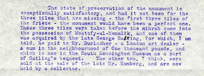 A few weeks later from Paris, Kevorkian sends Freer a six-page letter about the mihrab accompanied by fifteen-pages of translations of its inscriptions. He describes its architectural setting and refers back to Jane Dieulafoy (fig. 78):