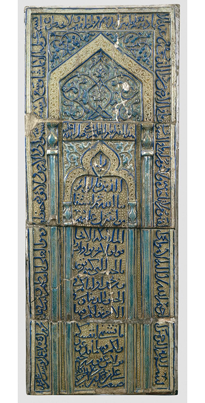 - In 1918, following several attacks on the Emamzadeh ʿAli b. Jaʿfar, religious authorities removed all remaining tiles from the interior and transferred them to the treasury of the Shrine of Fatemeh Massumeh. See Feyz, Ganjineh, vol. 2, 337–38. Although tiles from this mihrab are not recorded in the London catalogue, in a 1937 article, Yedda Godard notes that the final tile of the mihrab’s outer border—bearing the date and signature—was sent to London in 1931. See Godard, “Pieces datées de céramique de Kā͟s͟hān,” 312. ↩