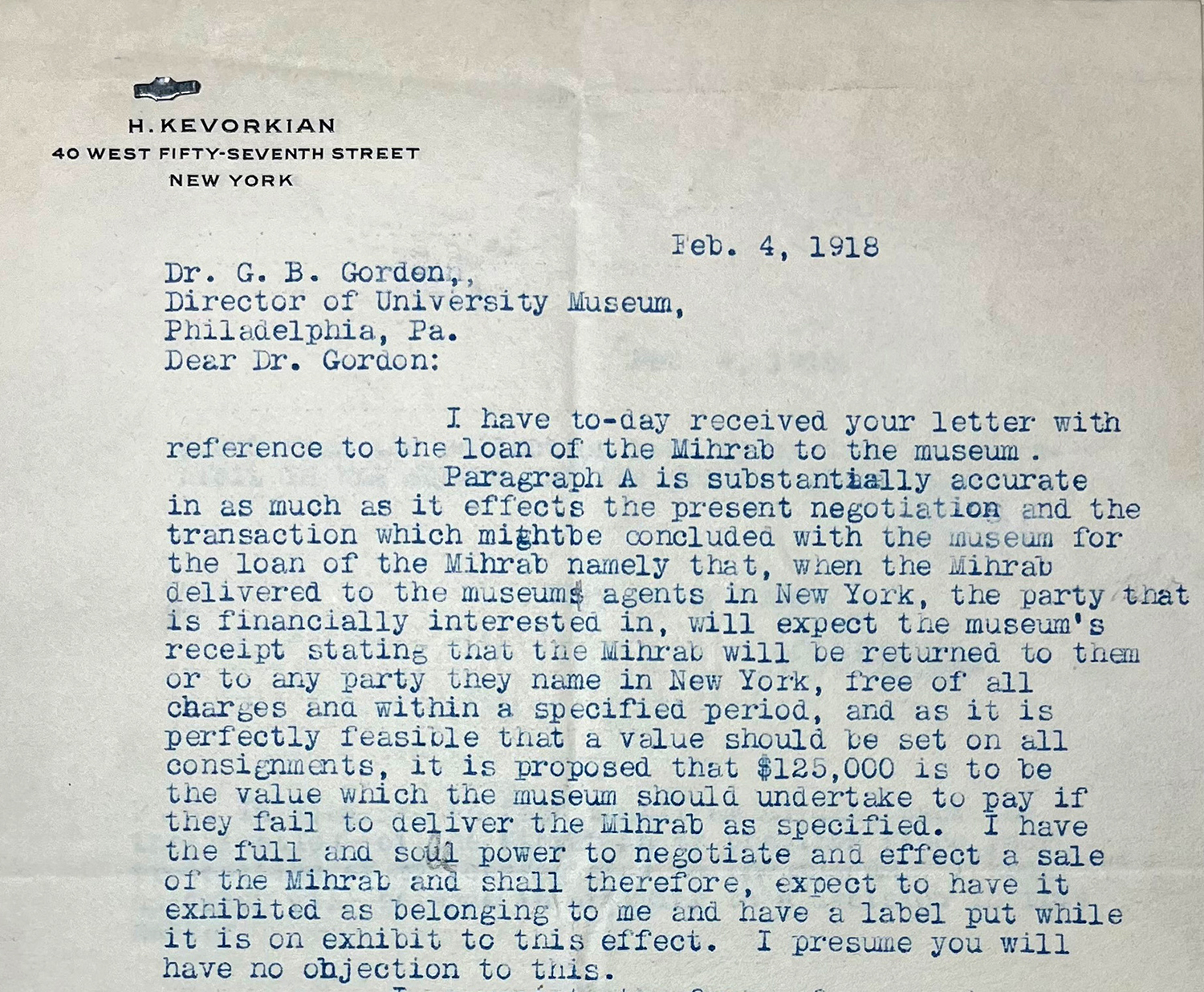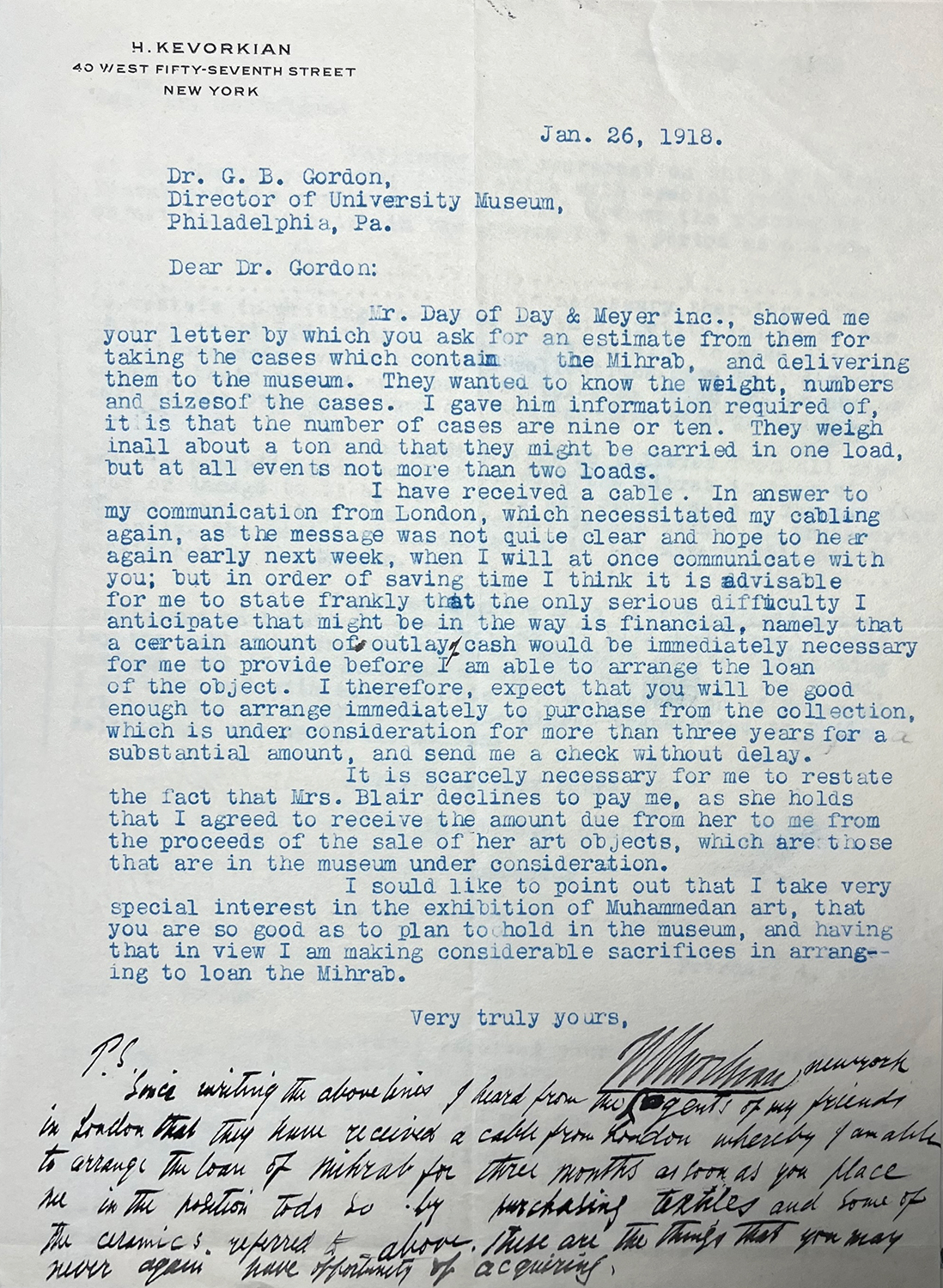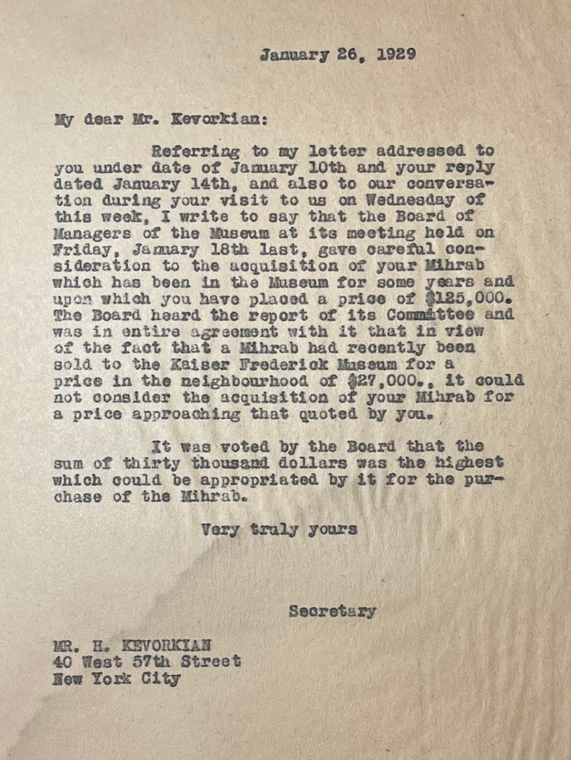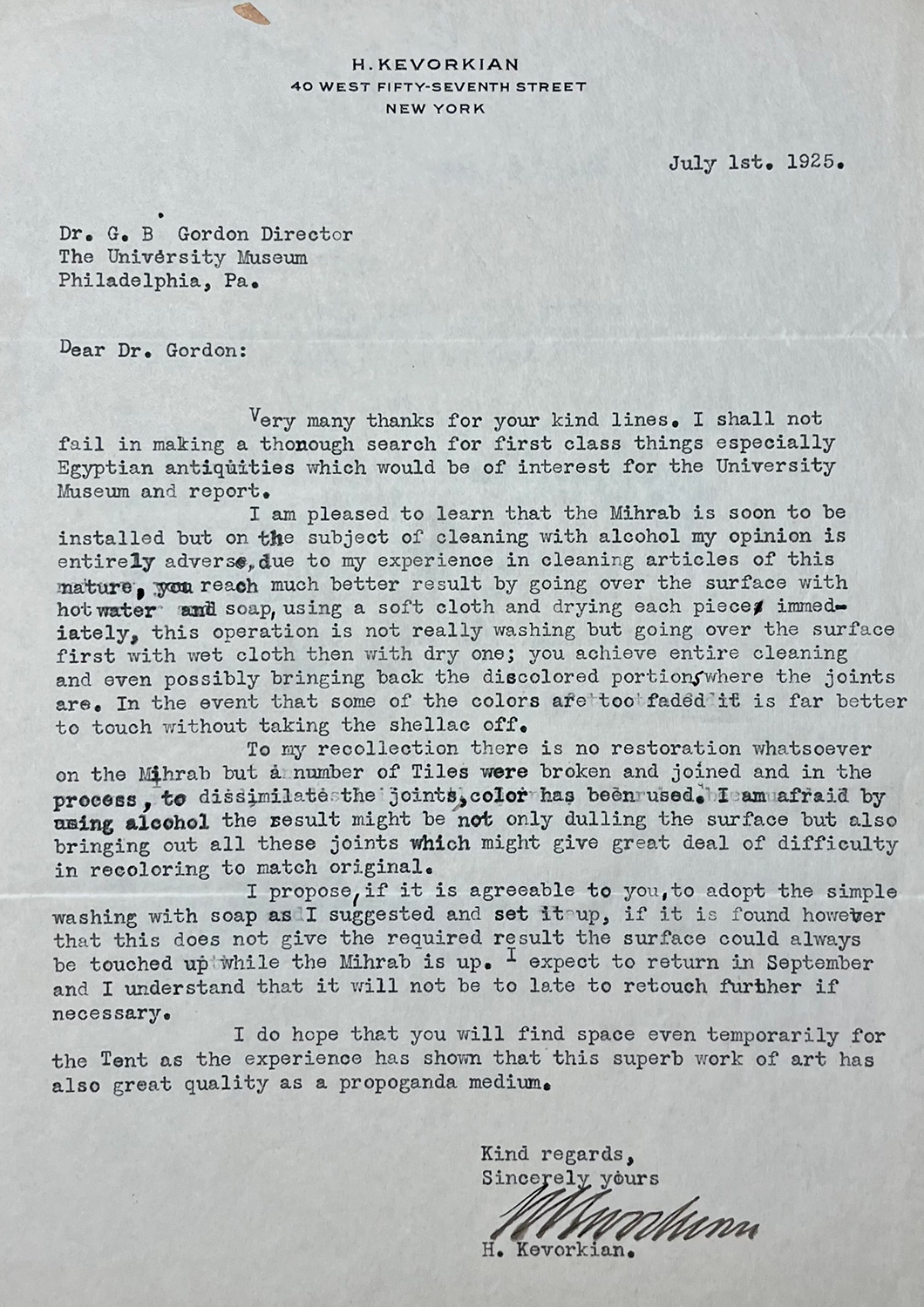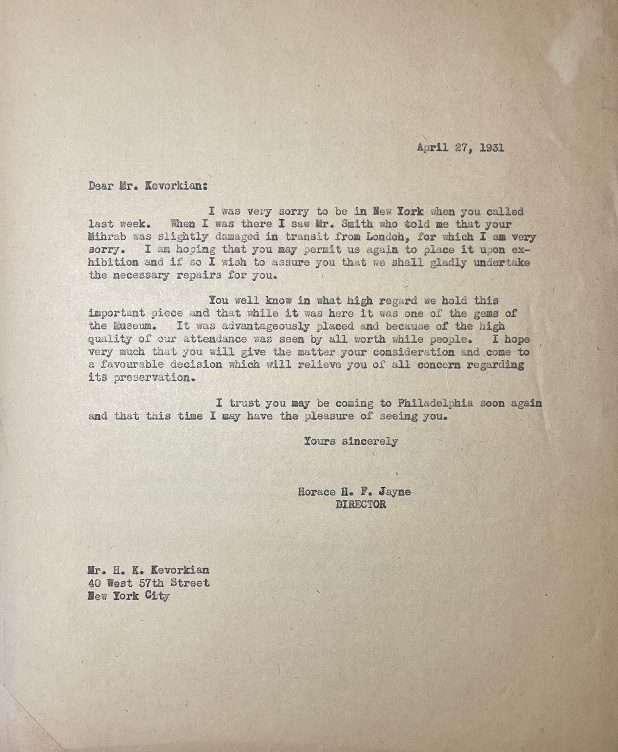 Although the mihrab remains in the Penn Museum for the next thirteen years, Gordon’s death likely plays a pivotal role in determining its ultimate departure from the institution. In the weeks following Gordon’s death, Jane M. McHugh, Secretary of the Board of Managers, reaches out to Kevorkian about his “property” in the museum, including the mihrab and sixteen other objects, including many works of ancient Egyptian art.148