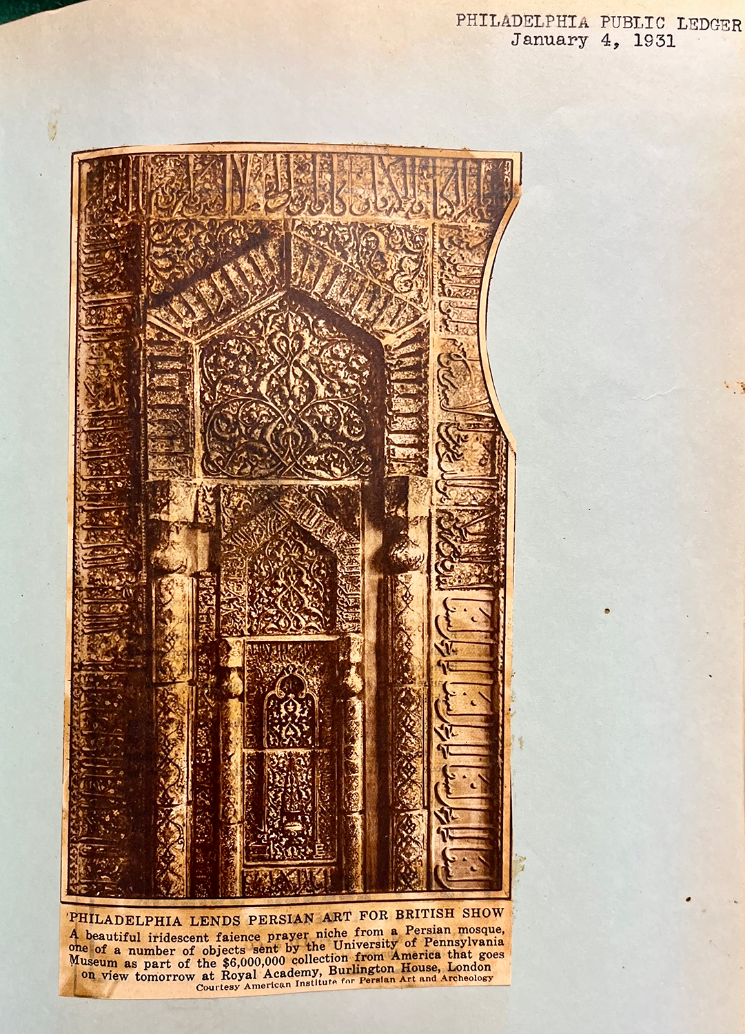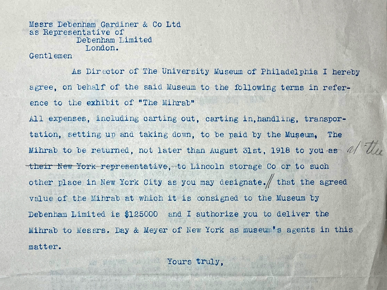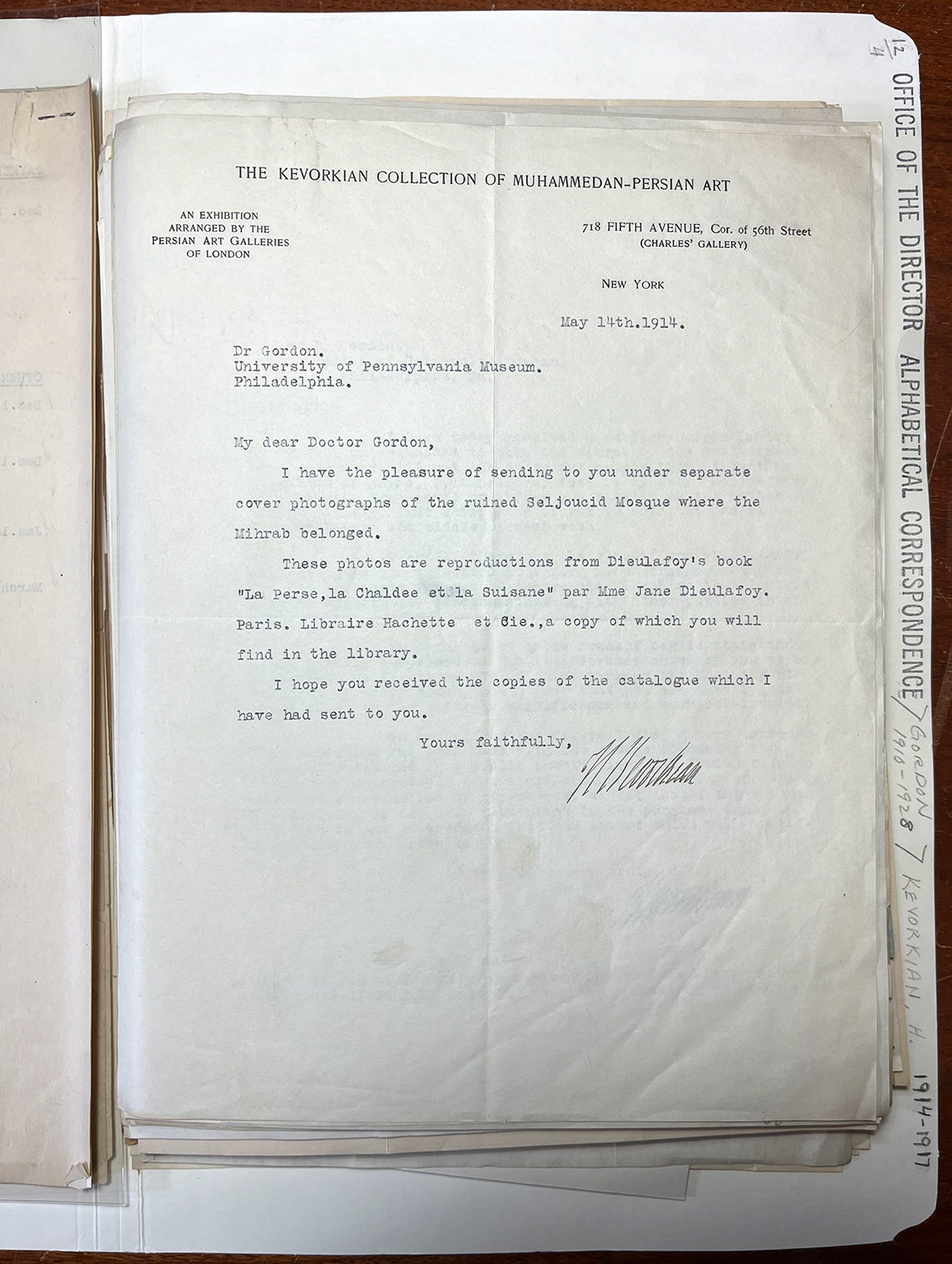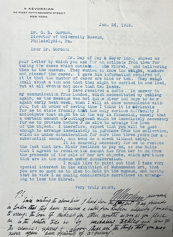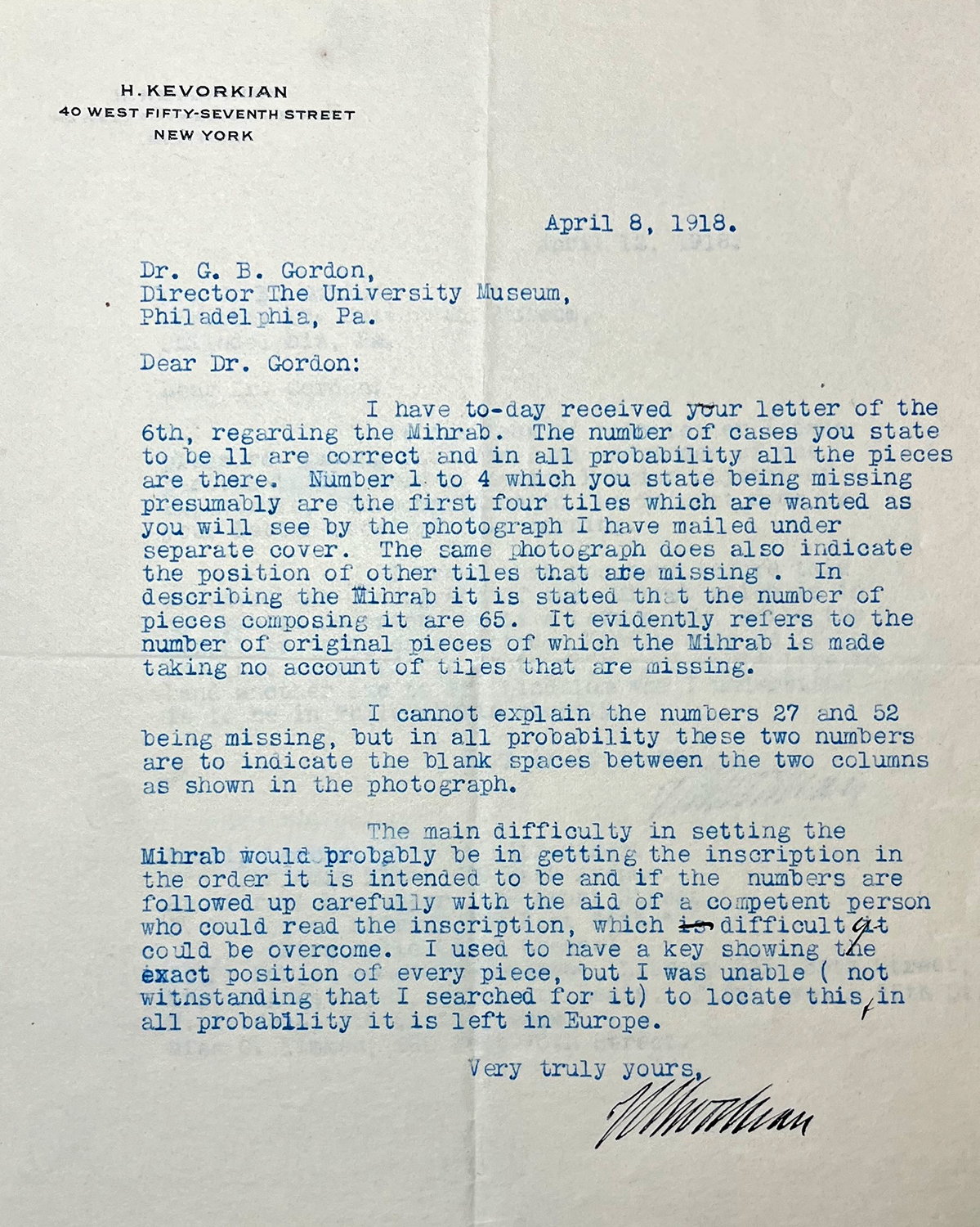 Although the mihrab remains in the Penn Museum for the next thirteen years, Gordon’s death likely plays a pivotal role in determining its ultimate departure from the institution. In the weeks following Gordon’s death, Jane M. McHugh, Secretary of the Board of Managers, reaches out to Kevorkian about his “property” in the museum, including the mihrab and sixteen other objects, including many works of ancient Egyptian art.148