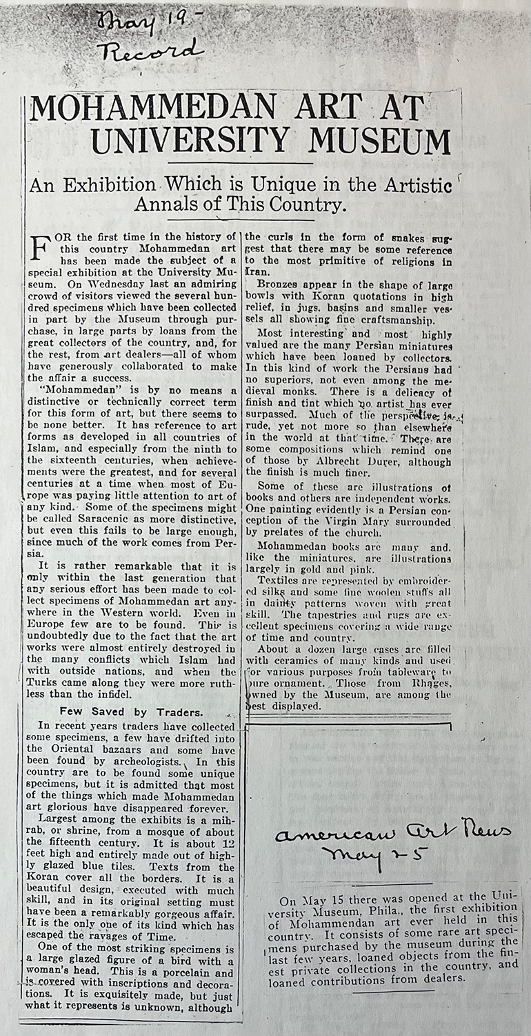 - Letters from Kevorkian to Jayne, 13 May 1931 (broken tiles) and 8 May 1931 (display preferences). Horace H.F. Jayne Director's Office Records, 0001.04, Box 9, PMA. ↩