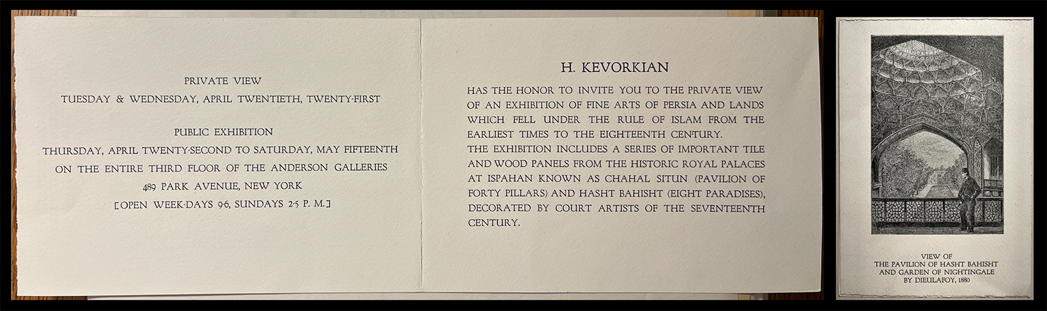 Kevorkian displays his Persian art collection at Anderson Galleries in New York (map). In advance of this exhibition, which was truly a sale, Kevorkian sends letters and private viewing invitations to many colleagues and potential buyers (fig. 109). He explains to Gordon (Penn Museum) that the purpose of the exhibition is “to afford to museum authorities and curators proper accommodation of inspection with minimum loss of time.”143 Kevorkian reserves several pieces for Gordon’s inspection, including a pair of doors said to be from the Chehel Sutun in Esfahan. He writes to the director, “I have been looking forward to have you see my collection of manuscripts and miniatures for a long time, I therefore, hope that you will not fail to honor me by visiting the exhibition.”144