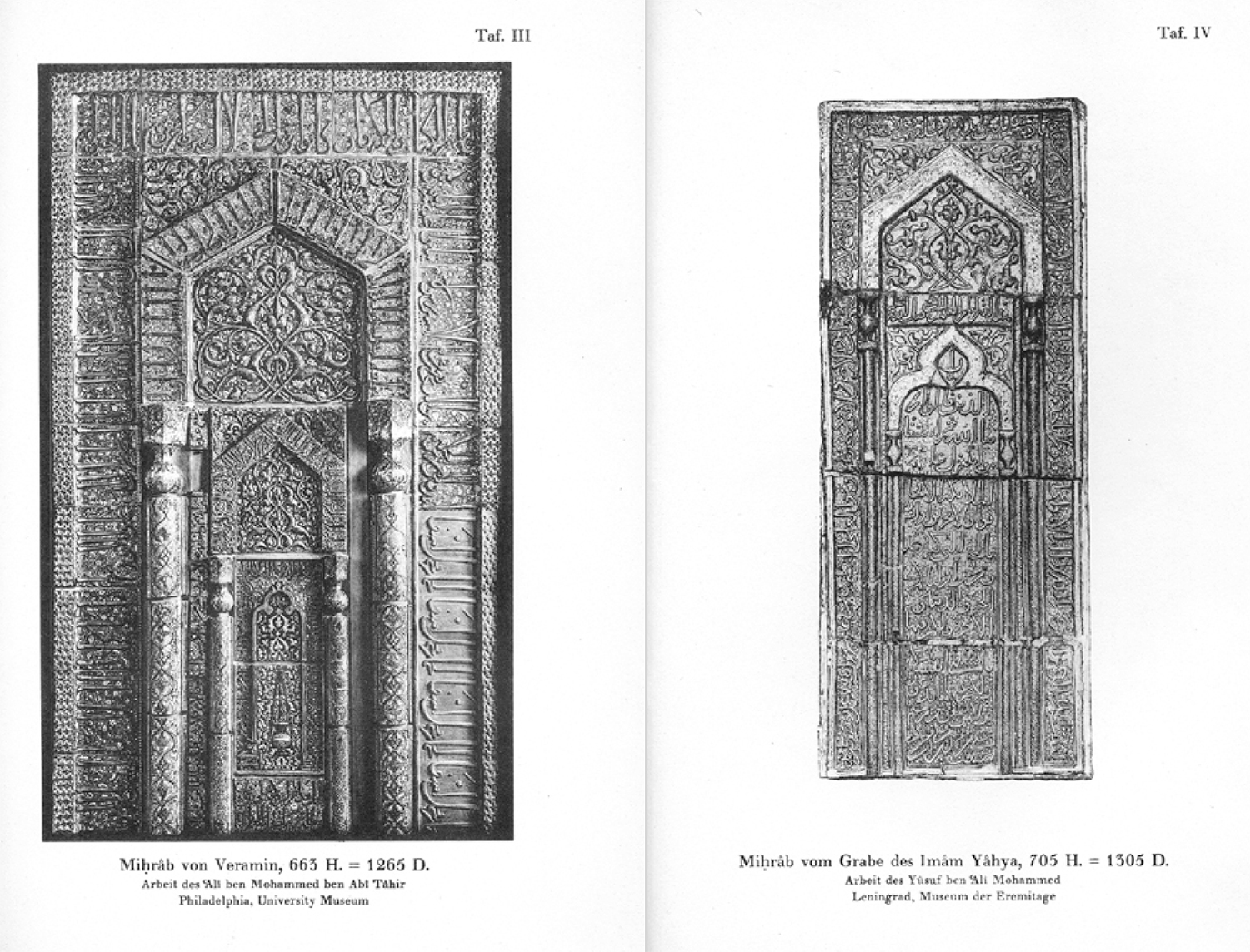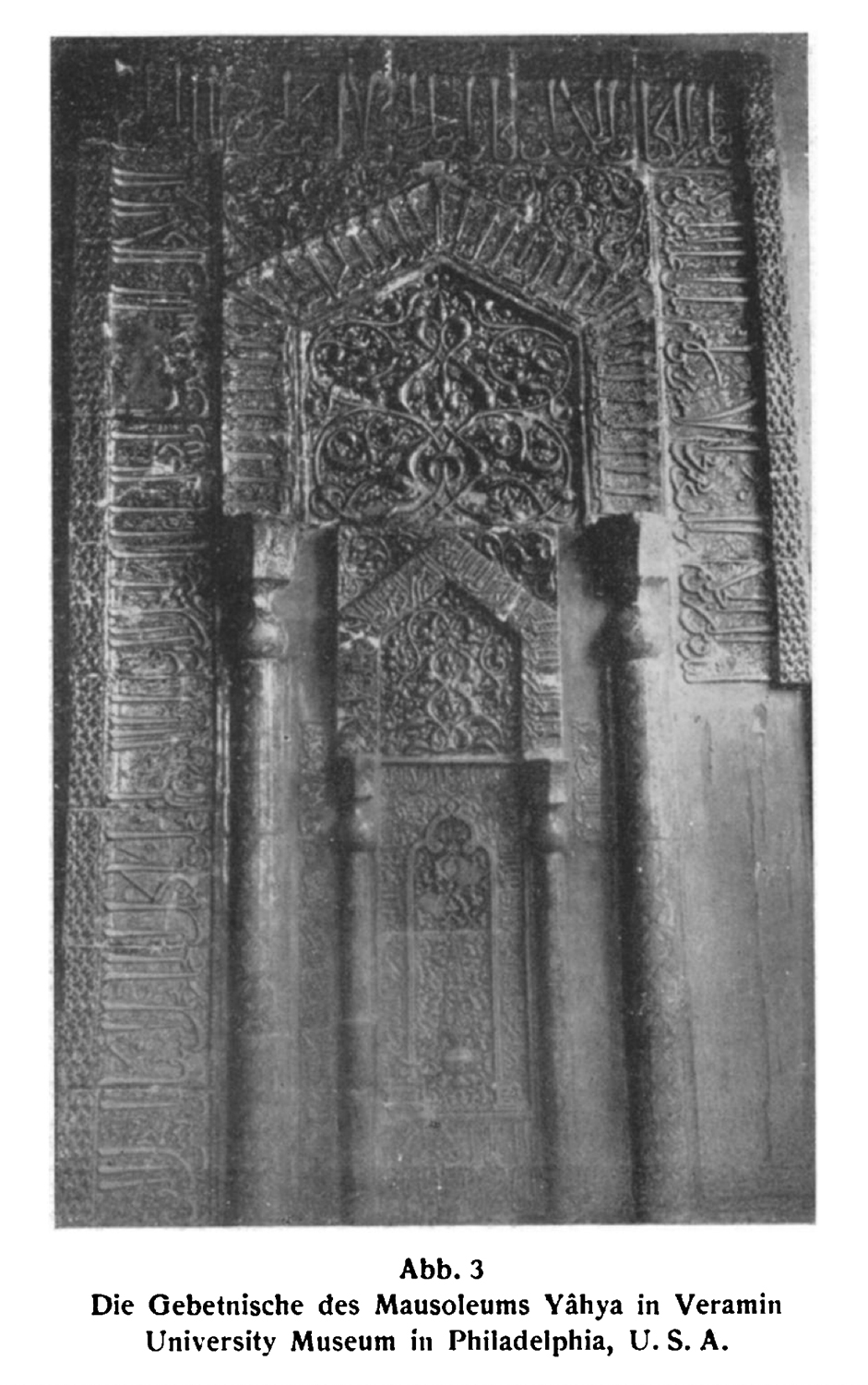 In an article written on the occasion of these acquisitions, Sarre reproduces the same photograph of the Emamzadeh Yahya’s mihrab that he first reproduced in 1910 (fig. 113). He draws a direct line between the West’s (Abendland) collecting of medieval Persian ceramics and the destruction of most of Iran’s mihrabs.150 He then highlights the Emamzadeh Yahya’s mihrab as the only other mihrab sent abroad relatively intact. The caption lists it as in the “University Museum in Philadelphia, U.S.A.”