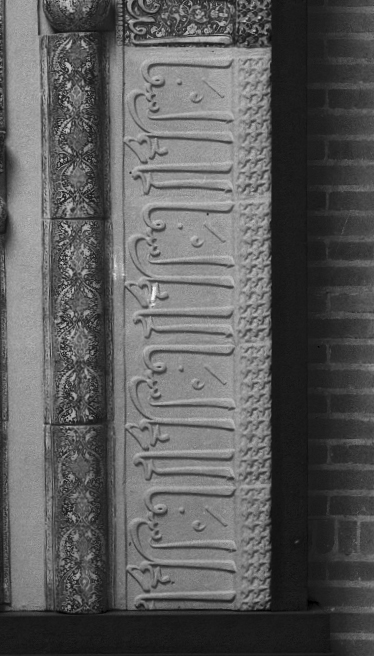 The mihrab’s missing tiles in between the columns and in the lower right are filled with white plaster. The tiles on the lower right—originally the basmala (the phrase that opens every sura of the Qur’an), followed by the first verse of sura al-Jumuʿah—are replaced with four identical pieces of molded plaster with الحمار یحمل اسفا. These words are borrowed from the second to last tile of the outer border, located in the lower left. In other words, a phrase at the end of the inscription is repeated four times at the start. This act of so-called reconstruction reveals a disregard for the mihrab’s sacred verses—which glorify God, his Messenger, and the sacred verses themselves—reducing them to meaningless and repetitive decorative filler. The individuals responsible for this intervention were clearly not familiar with the text, and the missing words could have been replicated with relative accuracy.