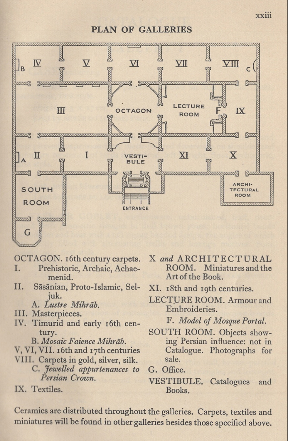 The exhibition includes over two thousand works of art lent by individuals and institutions from twenty-two countries, including Iran, and occupies almost all of the first floor of London’s Burlington House, part of the Royal Academy of Arts (map).154 The mihrab is displayed in a room at the back left (northwest) of the building, surrounded by carpets and luster tiles from different collections and sites (figs. 118–19). As in Philadelphia in 1918, it is elevated, but in this case, on a white pedestal. The mihrab’s importance to the exhibition curators is attested by an earlier plan of the galleries that positioned it on the main axis of the building, directly behind the central octagonal hall (figs. 120–21).