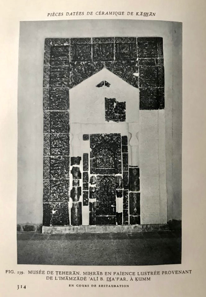 In addition to being integrated into the Emamzadeh Yahya’s mihrab (Varamin), tiles from the Emamzadeh ʿAli b. Jaʿfar mihrab (Qom) are also displayed on their own. A spandrel from this mihrab’s hood (no. 161 in the catalog) is displayed to the right of the Emamzadeh Yahya’s mihrab, albeit with its two parts in the wrong orientation (see the far right of fig. 119).159 These tiles are ultimately sent back to Iran and kept out of public view until they are transferred to Tehran in the lead up to the opening of the National Museum (map) in 1937. That same year, French artist-art historian Yedda Reuilly Godard (d. 1976) publishes the first scholarly article on the Emamzadeh ʿAli b. Jaʿfar’s mihrab, and its reproduction shows its highly fragmented and poor condition, including many missing tiles (fig. 124). Today, this mihrab has been highly restored, and Godard’s photograph offers an important reminder of original parts, albeit already highly impacted (fig. 125).