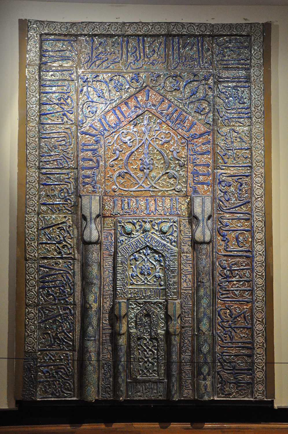 Largest among the exhibits is a mihrab or shrine, from a mosque of about the fifteenth century. It is about 12 feet high and entirely made out of highly glazed blue tiles. Texts from the Koran cover all the borders. It is a beautiful design, executed with much skill, and in its original setting must have been a remarkably gorgeous affair. It is only one of its kind which has escaped the ravages of Time.137