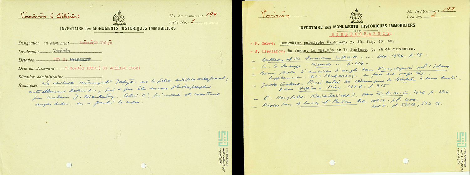 The Emamzadeh Yahya’s bilingual (Persian and French) inventory card records its name, location, date of construction (707 AH, from the stucco inscription), date of registration, and some remarks (fig. 131). The French card includes Godard’s handwritten notes, which presumably guided the Persian translation: