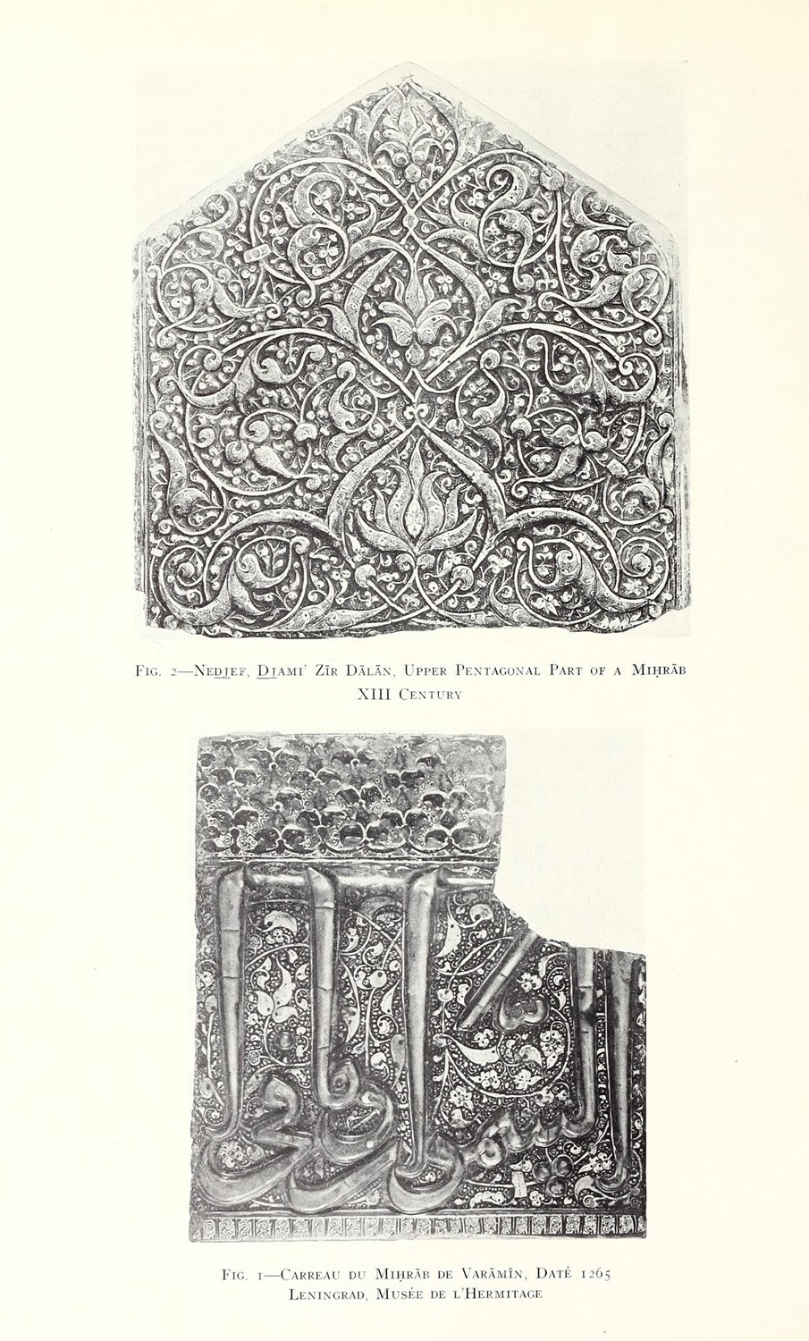 Kratchkovskaya’s article is preceded by two others on luster mihrabs: one by Dwight M. Donaldson on the two mihrabs in the tomb of Emam Reza at Mashhad (Checklist, no. 16) and one by Mehmet Aga-Oglu on the fragmented luster mihrab in a mosque in the Shrine of ʿAli at Najaf (see the hood in fig. 133). Donaldson reproduces a wide view of Emam Reza’s tomb showing its two mihrabs in situ, while Aga-Oglu attributes the Najaf mihrab to the workshop also responsible for “the Kevorkian miḥrāb in the University Museum, Philadelphia.”167 Considered together, the three Ars Islamica articles underscore a blossoming of scholarship on luster mihrabs in various guises—fragmented and relatively complete, in situ and in museums—and the centrality of the Emamzadeh Yahya’s mihrab in this research.