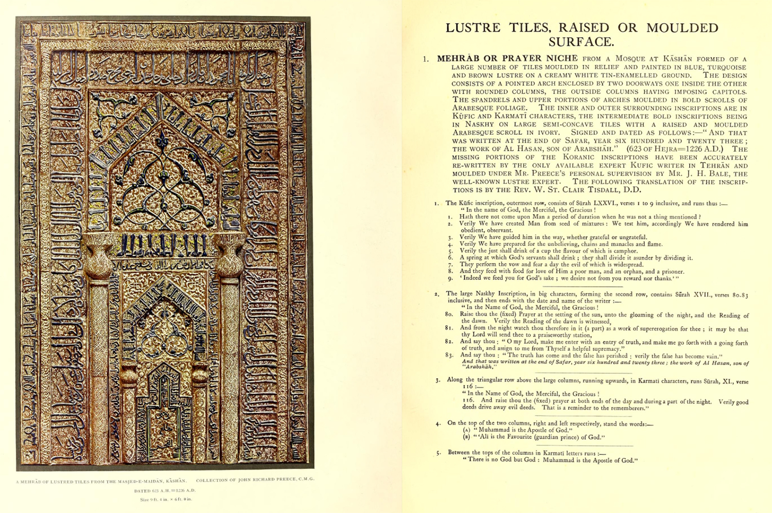 Friedrich Sarre, now the director of the Islamic department at the Kaiser Friedrich Museum (today’s Staatliche Museen zu Berlin, or State Museums of Berlin) reaches an agreement with Vincent Robinson & Co. (see 1913) to acquire the luster mihrab from Kashan’s Masjed-e Meydan. The agreed price for this mihrab and a set of two large tiles attributed to a shrine in Qom (no. 2 in the Preece catalog) is £6,900 ($33,534).149