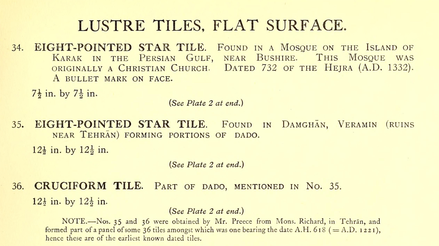The Preece sale also includes two star and cross tiles from the Emamzadeh Yahya that are described as “found in Damghān, Veramin (ruins near Tehrān)” and “obtained by Mr. Preece from Mons Richard, in Tehran” (figs. 74–75).108 Instead of identifying the source building, the entry names another city—Damghan—that is nearly 200 miles northeast of Varamin (map).109 This careless approach to architectural origin is contrasted to the accurate attention to provenance (past ownership), and specifically the dealer Jules Richard (see 1875–76). Naming Richard undoubtedly served to lure buyers and increase the tiles’ monetary value.