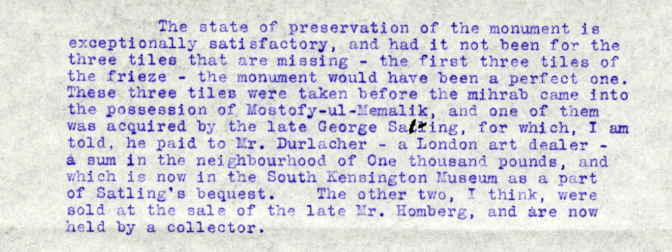 Have just secured famous mihrab of lustre tiles of Veramin mosque property of Mostofy Memalik [Mostowfi al-Mamalek] Persian Minister of War in far better condition and about twice as large as that of Preece [see fig. 73] quality infinitely superieur altogether by far finer monument now stored in Paris where could be viewed privately shall be pleased to hear if this is of interest to you pleased give you priority of right of refusal.