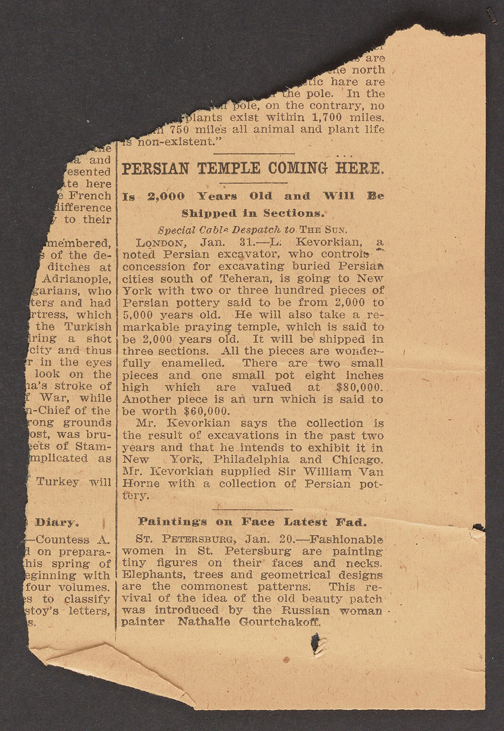 Kevorkian’s trip to New York is announced in a 31 January “Special Cable Despatch [sic]” to The Sun, likely sent in by the dealer himself (fig. 81). This dispatch describes Kevorkian as “a noted Persian excavator [note that he is identified as ‘Persian’ and that ‘archaeologist’ is not used], who controls concessions for excavating buried Persian cities south of Teheran.” The dealer-excavator is on his way to New York with “two or three hundred pieces of Persian pottery said to be from 2,000 to 5,000 years old” and “a remarkable praying temple, which is said to be 2,000 years old.”122 The end of the announcement mentions Kevorkian’s excavations of the last two years and forthcoming exhibitions-sales in New York, Philadelphia, and Chicago. The dispatch is quickly picked up by American outlets, including the New York Herald (1 February 1914) and The Houston Post (14 February 1914).