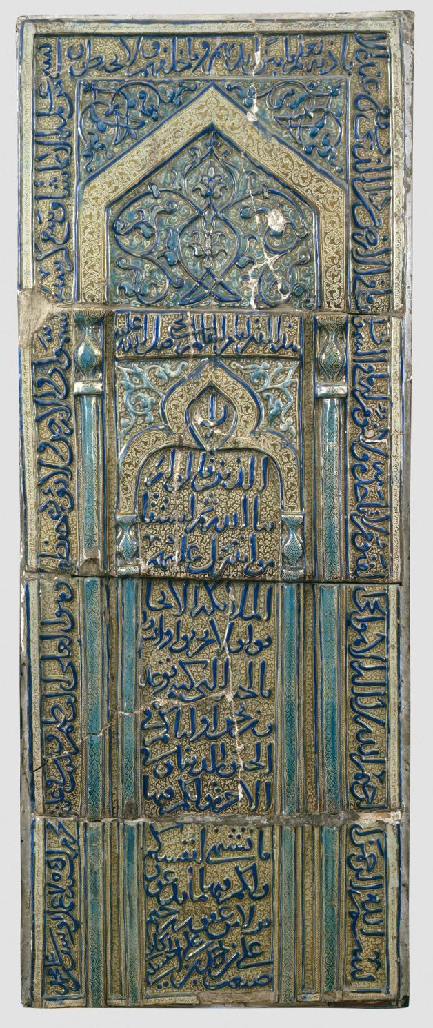 - Kratchkovskaya, “Fragments du Miḥrāb de Varāmīn,” 132–33. The tile in question is from the epigraphic frieze in the tomb of Shaykh ʿAbd al-Samad at Natanz (Metropolitan, 12.44). ↩