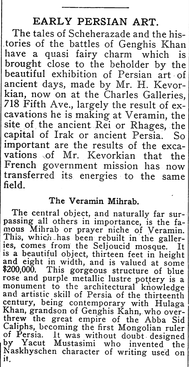A contemporary newspaper article describes the exhibition as the result of Kevorkian’s excavations “at Veramin, the site of the ancient Rei or Rhages,” further confusing the two distinct cities located twenty-five miles apart (fig. 86). The “Veramin Mihrab” is lauded as the “central object” coming from “the Seljoucid mosque” and “valued at some $200,000.”