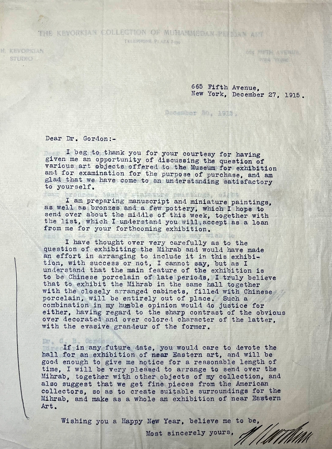 During the war, Kevorkian and Gordon stay in touch about several loans and purchases, and in December 1915, Gordon asks the dealer to send the mihrab to the museum for inclusion in an exhibition of Chinese porcelain. Kevorkian refuses this request, calling the display of the mihrab alongside Chinese porcelain “entirely out of place” (fig. 91). Instead, he proposes a future exhibition on “near Eastern Art” that would include the mihrab and other materials in his collection.