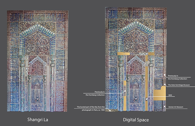 In a digital environment, we have the opportunity to reimagine and partially restore some of this inaccuracy and incompleteness. The visual timeline above begins with Dieulafoy’s photograph of the mihrab in situ and deliberately includes some of the surrounding qibla wall, which is notable for its soaring verticality, a stark contrast to the mihrab’s current claustrophobic setting. The final image—a digital visualization—achieves several goals (fig. 280). It moves currently jumbled tiles to their correct locations and re-places the three tiles in the lower right border (the tile in between those now in the Denver Art Museum and Hermitage remains to be identified). It also reconstitutes the inner border as a continuous frame by indicating the upper horizonal row, thus increasing the mihrab’s height and balancing its proportions. Some isolated tiles have been reunited with this border, including the example in the MAK. Finally, the buried tile on the lower left is reearthed and re-seen via an archival photograph. The virtually reunited tiles are labeled by their current repositories, and still missing pieces are left blank, with the hope that they might be found one day. The study of the Emamzadeh Yahya’s mihrab is by no means done or exhausted, and we will continue to add to its layers of understanding. Other museumized masterpieces might warrant similar revisitations and expansions.