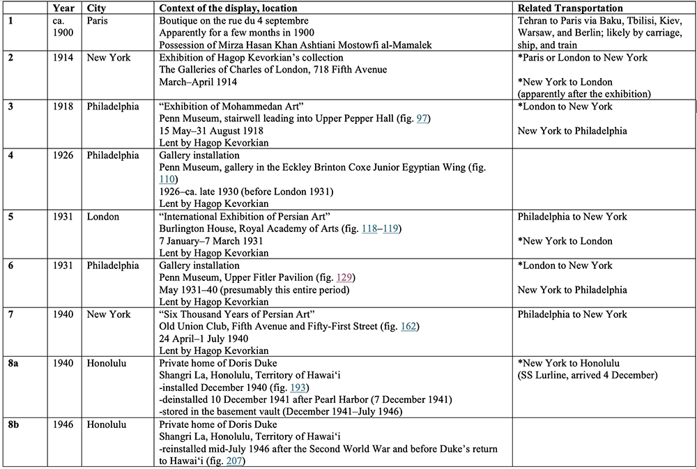 Chaotic circumstances in Iran during the last decades of the Qajar dynasty (1786–1925) created a vulnerable climate for cultural heritage. While Iranian officials and European elites profited off cultural patrimony, dealers initiated commercial digs throughout the country, especially on the Tehran plain around Rey and Varamin. One such dealer was Hagop Kevorkian, who purchased the mihrab from Mostowfi al-Mamalek in 1912–13. The sale of the mihrab to a foreign dealer launched the ensemble into a new phase of possession, one that prioritized its constant display and publication to increase its financial value and opportunities for sale. Under Kevorkian’s purview, the mihrab was displayed six times in twenty-six years in three cities (Table I).