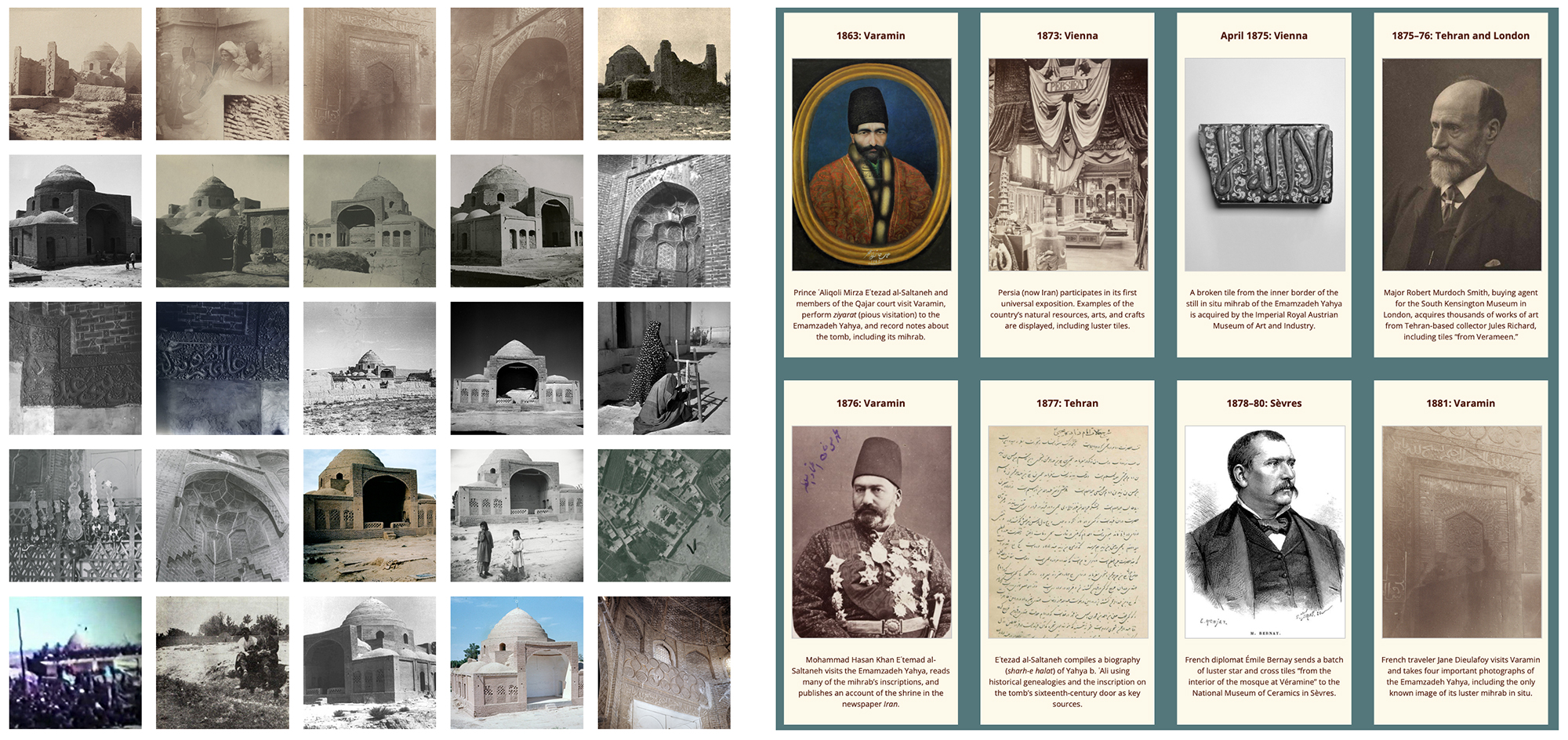 When the mihrab was removed from the tomb of Yahya b. ʿAli and the Emamzadeh Yahya complex as a whole—its home of over six hundred years—it entered a state of unprecedented risk and mobility. In addition to surviving two world wars and the vulnerabilities of being personal property in a private home for fifty-three years, it was shipped across an ocean six times and installed and deinstalled for exhibition at least seventeen times in forty-six years.253 This figure is staggering for such a large, heavy, and complex multi-unit ensemble and prompts reflection on today’s museumscape, wherein hyper-preciousness can prohibit researchers from handling already broken luster tile fragments, even when wearing gloves. The mihrab’s resilience and layered evolution recalls that of the Emamzadeh Yahya complex itself, and the addition of the mihrab’s visual timeline to this website facilitates a shared exploration of their trajectories, furthering their reconnection (fig. 281). Neither story can be told irrespective of the other.