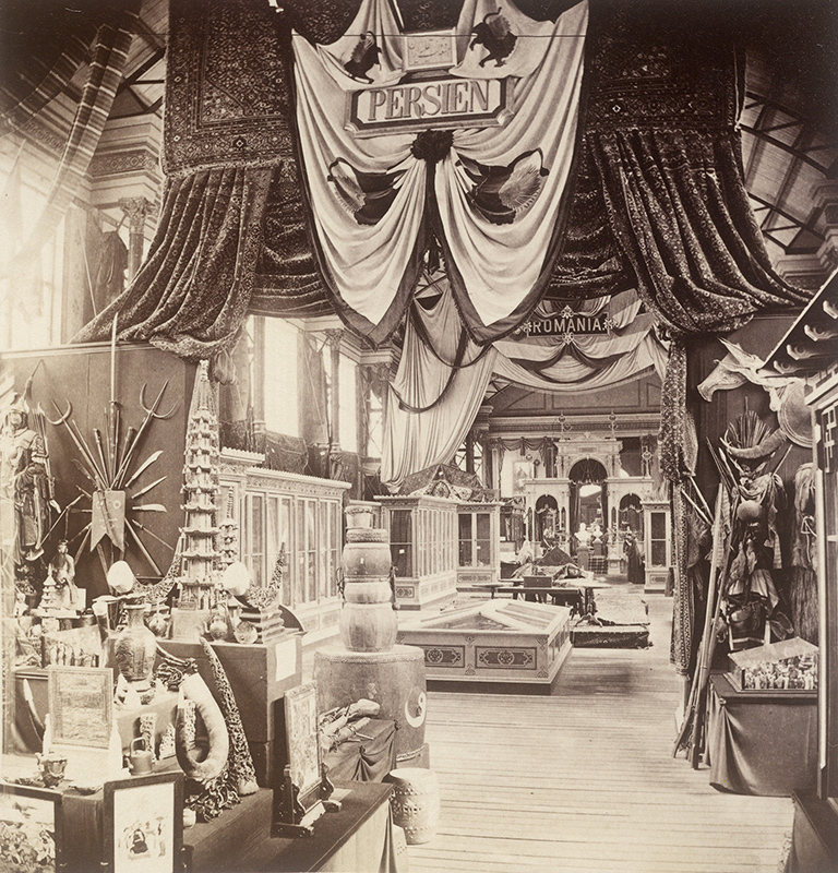 Persia (now Iran) participates in its first world fair, the Weltausstellung (Universal Exhibition). Architects from Iran are involved in the construction of the pavilion, and Naser al-Din Shah, who is traveling to Europe for the first time, visits the event along with Prince ʿAliqoli Mirza Eʿtezad al-Saltaneh, the minister of science, and Mirza Hossein Khan Moshir al-Dowleh Sepahsalar, the prime minister (d. 1881).4 Examples of Persian natural resources and arts and crafts in different media are displayed in a bazaar-like interior in the Industriepalast (Palace of Industry) alongside goods from China and Romania (fig. 11).5