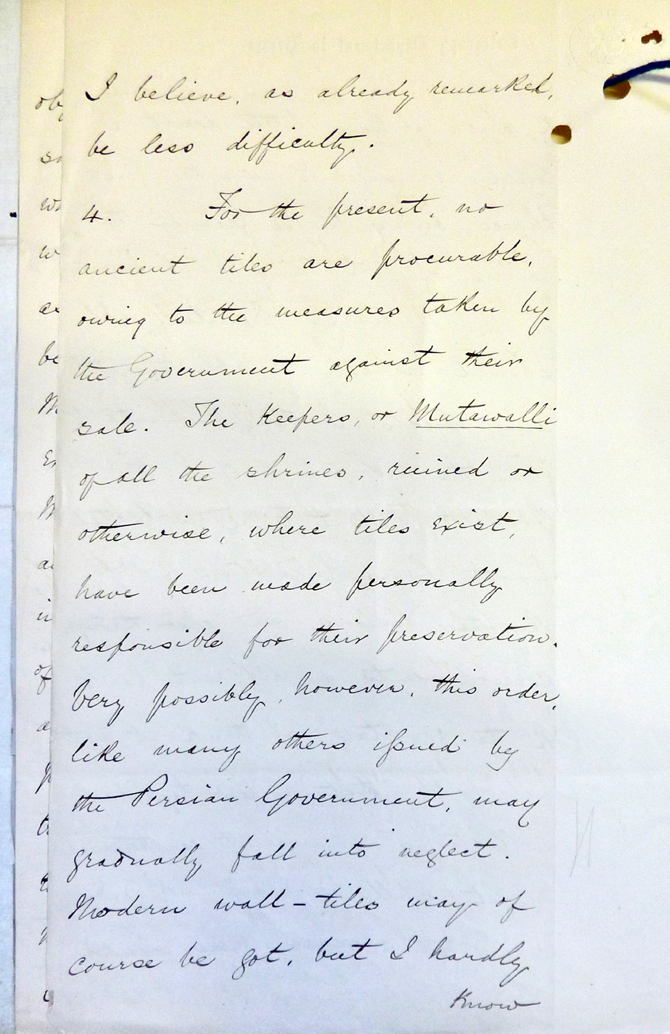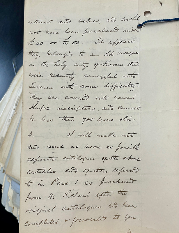 I have recently examined in a cursory manner a very valuable collection of Persian articles belong to M. Richard, a French Mussulman who has been resident in Teheran. The collection comprises articles of about every class, and has been formed gradually in the course of nearly 30 years. Most of the objects are packed away in boxes but I am now getting them unpacked and a catalogue made. I have induced M. Richard to agree to my proposal to fix a price for each article, and at such prices to give the Museum the refusal of the whole or any portion of the collection. I propose to begin with the China & Fayence (vid. 3).