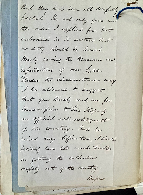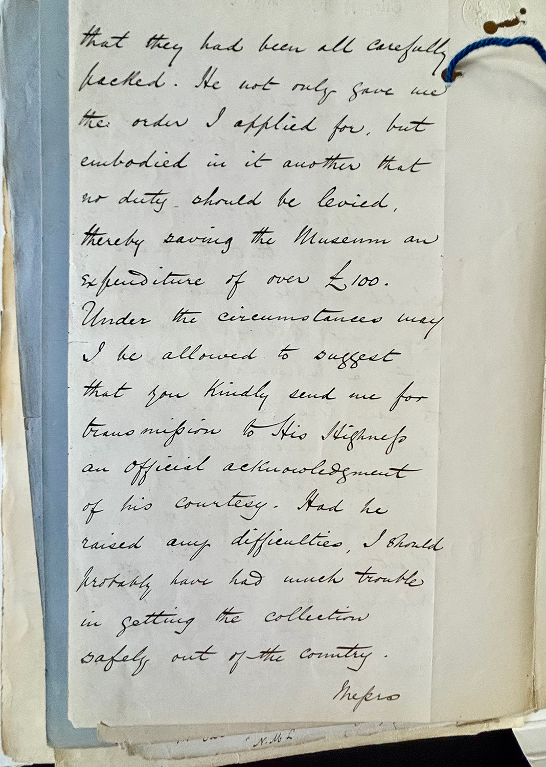 Without such an order I hardly know how I could have got the semi-sacred contents of the cases out of the country in safety. May I therefore be allowed to suggest that another letter of thanks be forwarded to his Highness for his courtesy?16