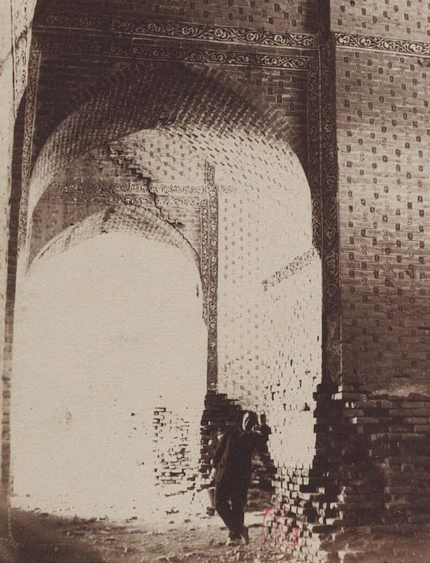 French traveler and budding amateur photographer Jane Dieulafoy (d. 1916) visits Varamin during a year-long tour of Iran with her archaeologist husband Marcel (d. 1920) (fig. 25). The couple carries a letter from the French Ministry of Foreign Affairs but are not part of an official expedition.32 On 7 June, they have a brief audience with Naser al-Din Shah in Tehran, and Jane photographs some children from his family. Upon arriving at the Emamzadeh Yahya eleven days later, the Dieulafoys are confronted by a “mollah” and “paysans armés de batons” (peasants armed with sticks), as described in her subsequent newspaper article (jump ahead to 1883).33 She photographs this group, describes their presence as a response to the recent “vols” (thefts) of the shrine’s tiles, and mentions a “loi commune” (common law) prohibiting Christians from entering such religious sanctuaries, which was perhaps tied to the government order described by Murdoch Smith in 1876 (fig. 26; see fig. 19). With the assistance of an order issued by Naser al-Din Shah, the couple enters the shrine, meaning that the shah’s permit seems to have overridden the site’s local protections.