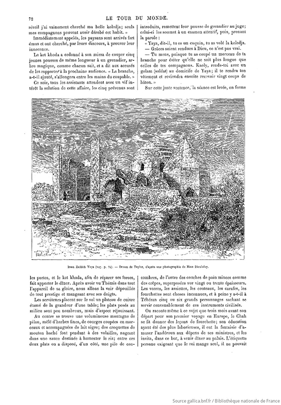 Five years after her 1883 Le Tour articles, Dieulafoy publishes La Perse, la Chaldée et la Susiane, a lavish tome accessible only to a privileged few. The text and images in the Varamin section are very similar to those in the Le Tour article, but some small edits can be discerned. One example is Dieulafoy’s improved transliteration of the Emamzadeh Yahya: “Il n’est pas possible d’obtenir des émaux plus purs et plus brillants que ceux de l’imamzaddè Yaya.”38