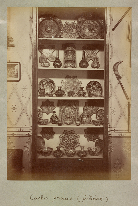 Antoine Sevruguin (d. 1933)—or a member of his studio—photographs a cabinet filled with many kinds of luster tiles and objects in Jules Richard’s (see fig. 15) Tehran house (fig. 33). Five tiles (three stars and two crosses) probably from the Emamzadeh Yahya are included in the cabinet and may have been recently removed from the tomb and transported to Tehran. This display presents a microcosm of Persian luster production between vessels and tiles and across many centuries (Ilkhanid to Qajar periods). It also represents the luster traditions of fifteenth- to sixteenth-century Spain (see the two large dishes at the top). The photograph is perhaps taken as a marketing device and used to draw more attention to Richard’s collection. He had already sold hundreds of luster pieces to the South Kensington Museum and would continue to diffuse his collection (for what we can locate today in this cabinet, see Luster Market).