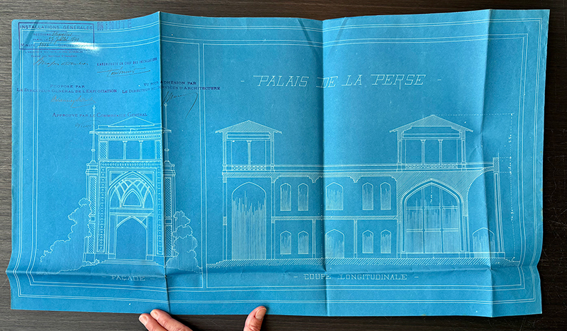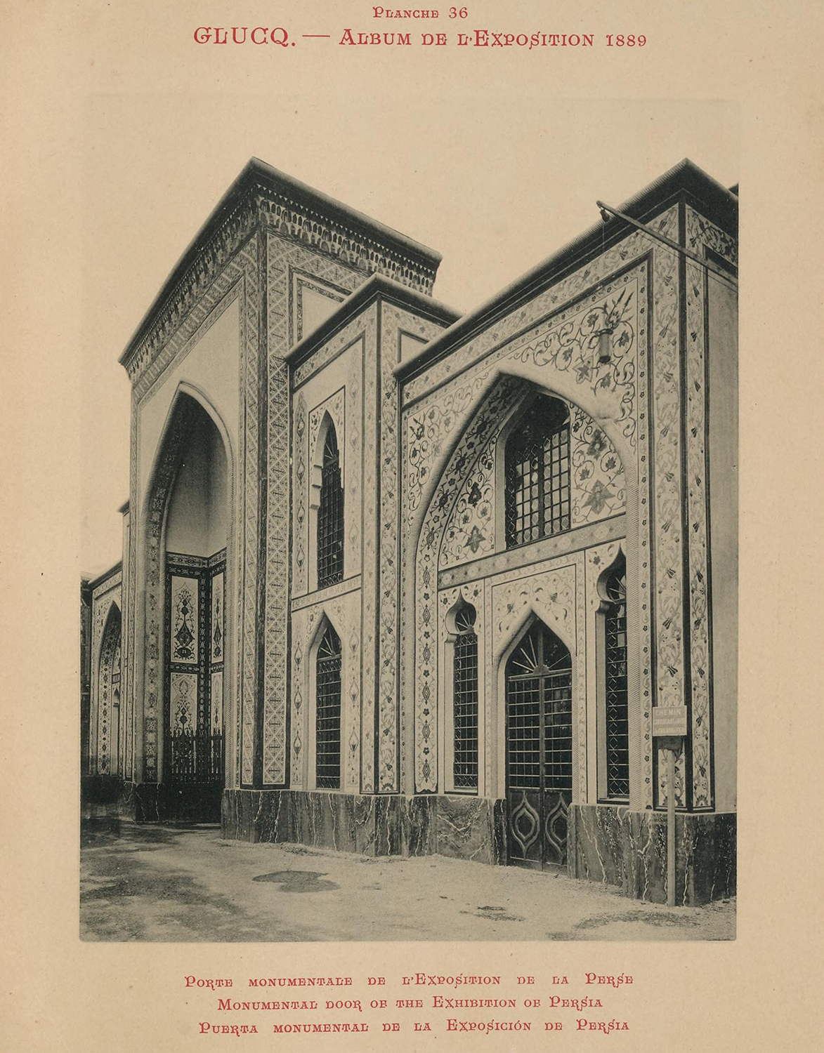 The Persian pavilion is one of more than fifty pavilions representing forty-three ‘nations’ at the Exposition Universelle (fig. 43). It is designed by French architect Philippe Mériate under the supervision of General Antoine Kitabgi Khan (d. 1902), the General Commissioner for Persia, and said to reproduce “le Palais Medressyé Maderschachi,” in fact the Madreseh-ye Chahar Bagh in Esfahan (map).54 The multistoried, long building includes three rooms comprising the “grand salle d’exposition,” a theater, and several pillared terraces (figs. 44–45).