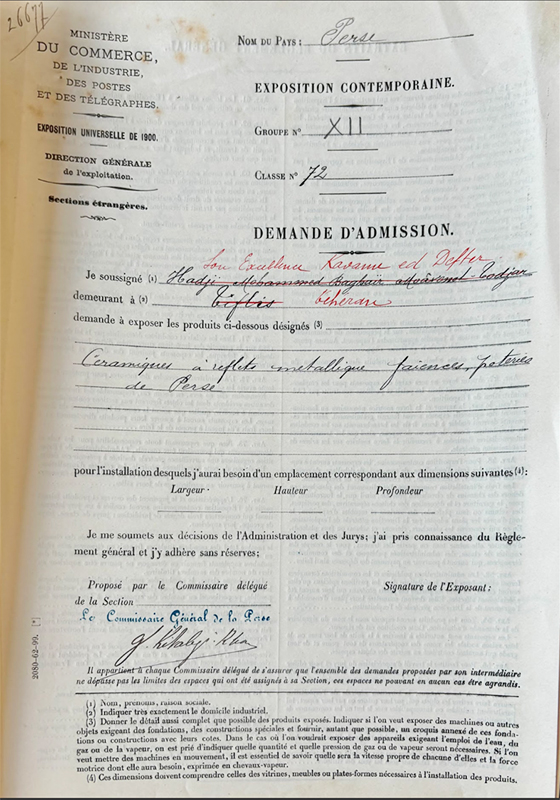 During his journey to Paris, Mostowfi al-Mamalek is accompanied by several Qajar princes, including his brother-in-law Dust-ʿAli Khan, a member of the prominent Moʿayyer al-Mamalek family. The correspondence between these Qajar elites in Paris and their relatives back in Iran, namely Dust-Mohammad Khan Moʿayyer al-Mamalek (d. 1912), Dust-ʿAli Khan’s father and Mirza Hasan Khan Ashtiani’s father-in-law, reveals how they spent considerable sums of money acquiring things on their trip, particularly at the Exposition Universelle, and how urgently they sought additional funds.60 One apparent source of financial support for this extravagant spending was the sale of valuables brought with them from Iran, notably pearls and tiles. A letter from Amanollah Mirza Jahanbani (d. 1912) to Dust-Mohammad Khan on 28 Jamadi al-Awwal 1318/23 September 1900 reflects on the uncertain prospects of selling pearls and tiles and expresses frustration over the lack of interested buyers: