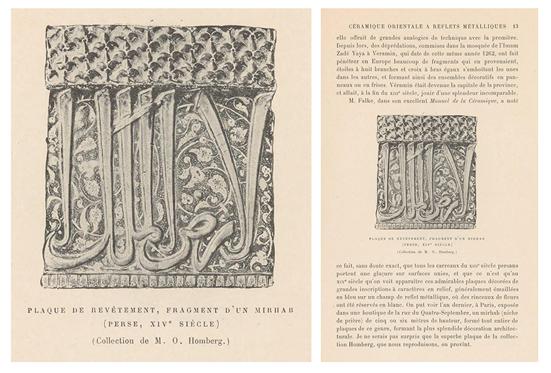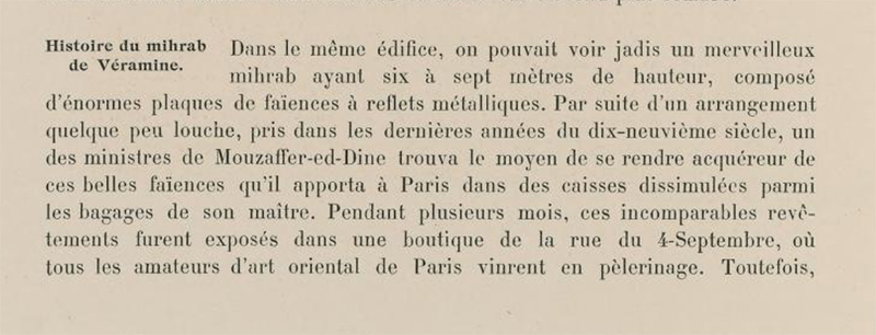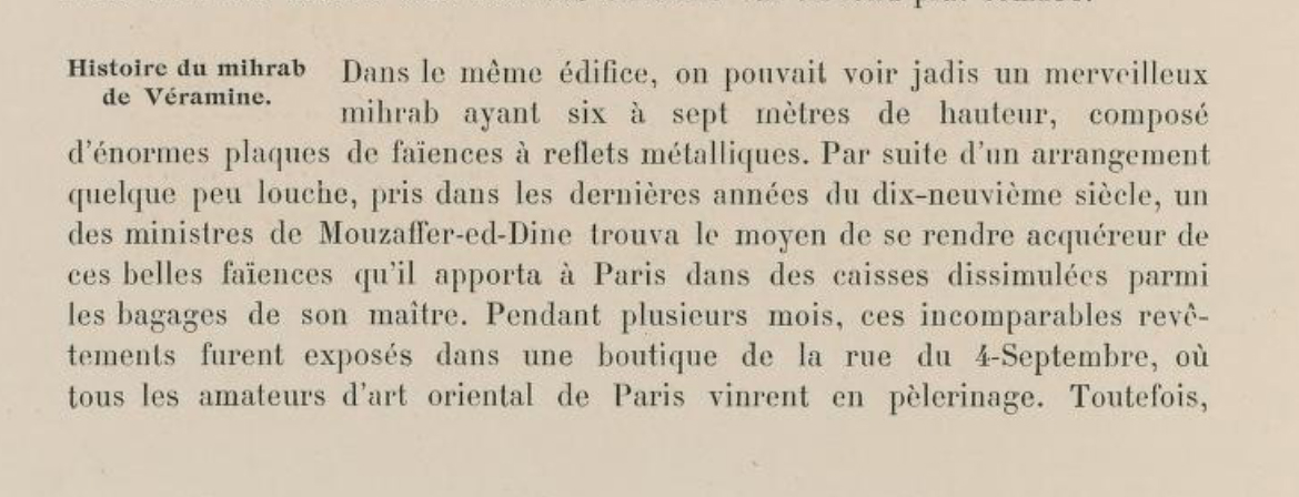 It is currently unclear when and how the mihrab was removed from the Emamzadeh Yahya and entered Mostowfi al-Mamalek’s possession. We know it was in situ in 1881, but we also know that at least one tile from the ensemble was in Vienna by the 1880s, if not earlier. It is probable that individual pieces were taken from the mihrab while it was still in the tomb, thus coinciding with the removals of luster tiles from the dado and cenotaph. It is also possible that significant time had elapsed between the mihrab’s complete theft from the tomb and its shipment to Paris in 1900. In other words, it could have been stored in Iran for years. On the uncertainties and mysteries surrounding the Emamzadeh Yahya during this period, see our chronological history of the shrine.