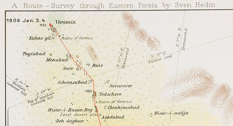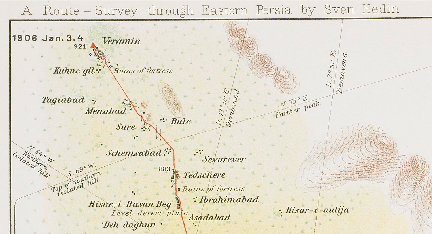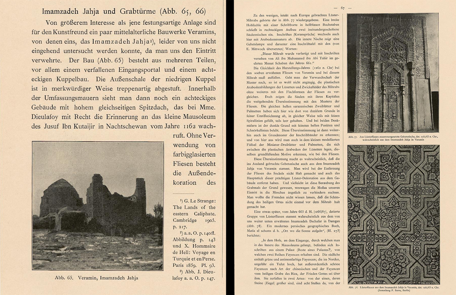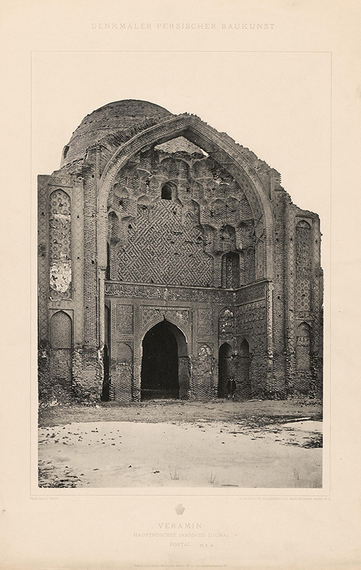 German art historian Friedrich Sarre (d. 1945) visits Varamin and surveys its major monuments. Unlike Dieulafoy sixteen years earlier (1881), he is denied entry into the Emamzadeh Yahya but takes an important general photograph of the site. It will take over a decade for him to publish this view (jump ahead to 1910).