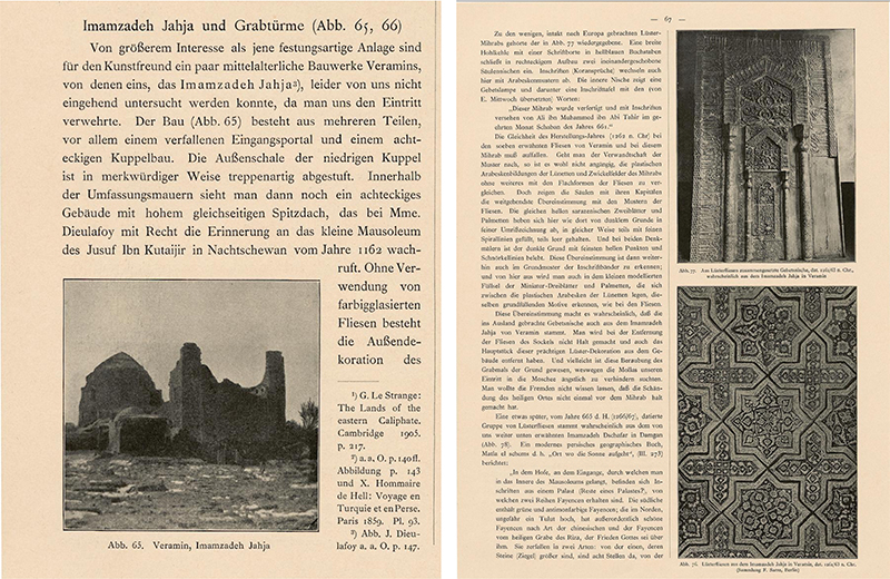 Friedrich Sarre displays his collection at the Museum of Applied Arts (now Gropius Bau) in Berlin (map). His collection includes many luster tiles acquired during his travels in Iran, some presented as single tiles and some as larger panels. The latter includes a panel of stars and crosses from the Emamzadeh Yahya, immediately distinguished by their large size.50