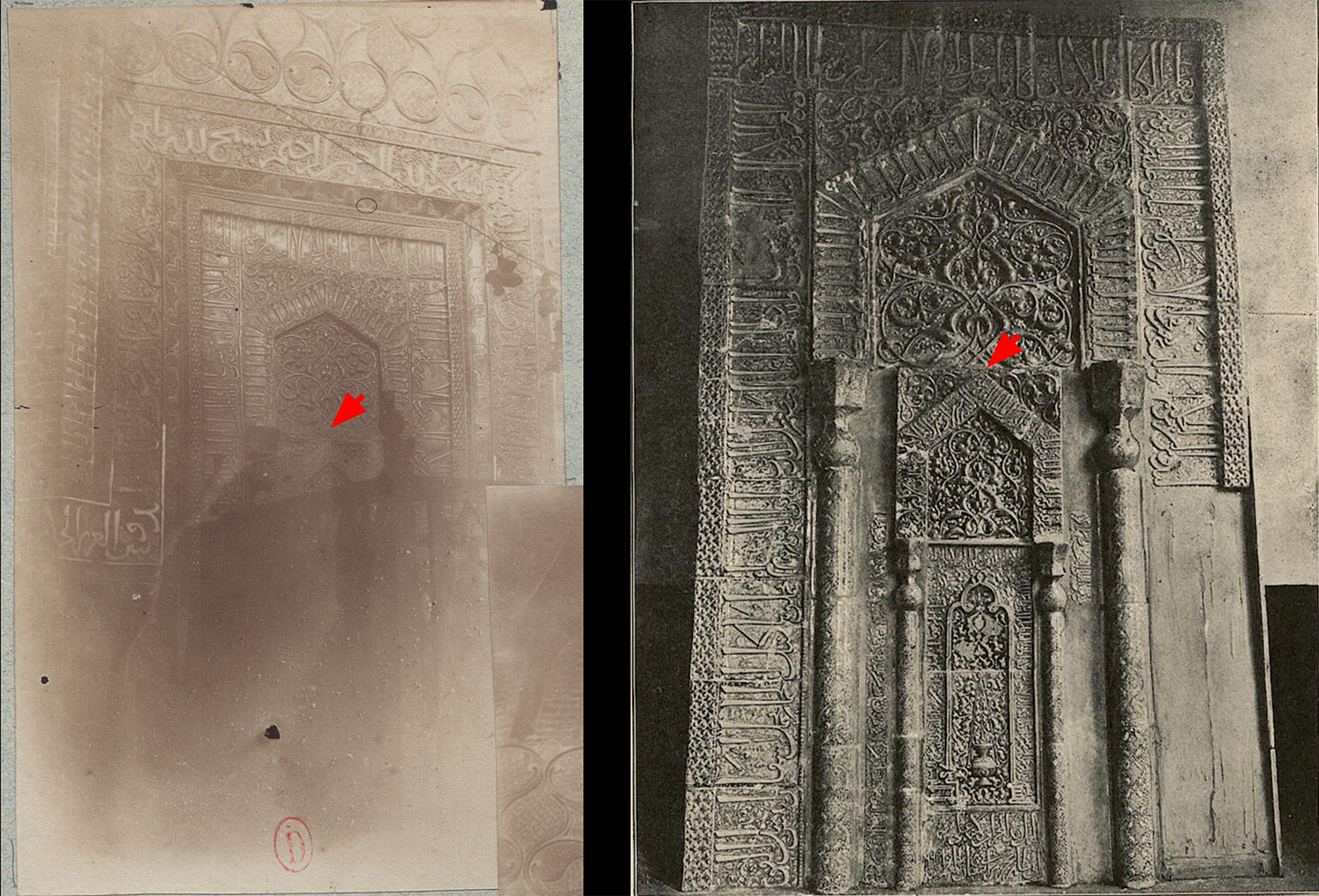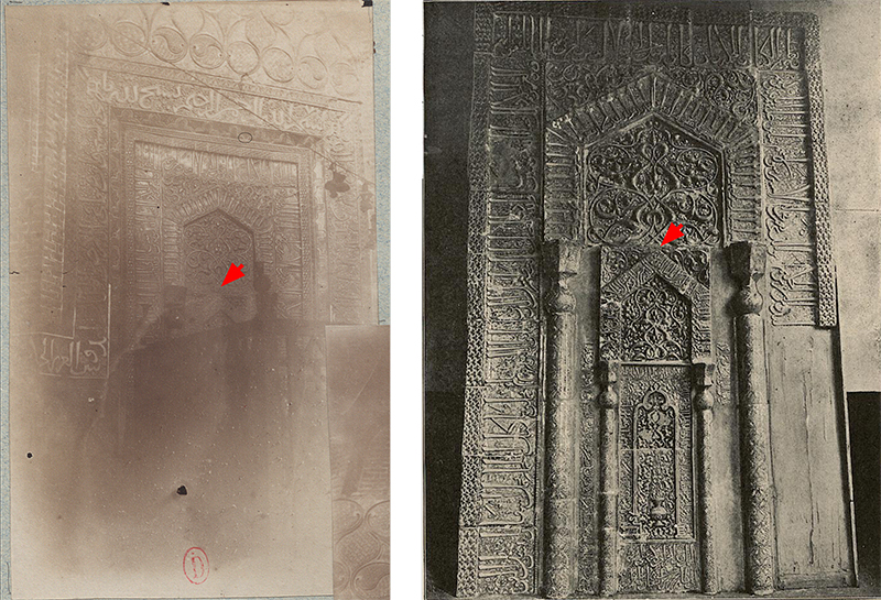During her visit to the Emamzadeh Yahya, Dieulafoy takes four photographs, including a general view of the complex, which remained in its Ilkhanid-period configuration, and the only known image of the tomb’s luster mihrab in situ (figs. 27–28). The latter photograph is an invaluable record on four levels. First, it clarifies the mihrab’s relationship to surrounding architectural elements on the qebleh (qibla) wall. It was not only framed by the surviving stucco inscription dated Moharram 707/July 1307 (forty-two years after the mihrab’s date) but also two smaller borders, one of which was composed of luster half star and half cross tiles. Second, it documents the upper half of the mihrab in its original form. As we shall see, some of its over sixty tiles were soon removed, lost, or jumbled. Third, it shows the mihrab in relation to the wooden screen shielding the cenotaph, which Eʿtemad al-Saltaneh measured and described in 1876. Fourth and finally, the photograph captures some ritual objects and votives that confirm the tomb’s living sanctity despite the poor condition of some parts of the complex.
