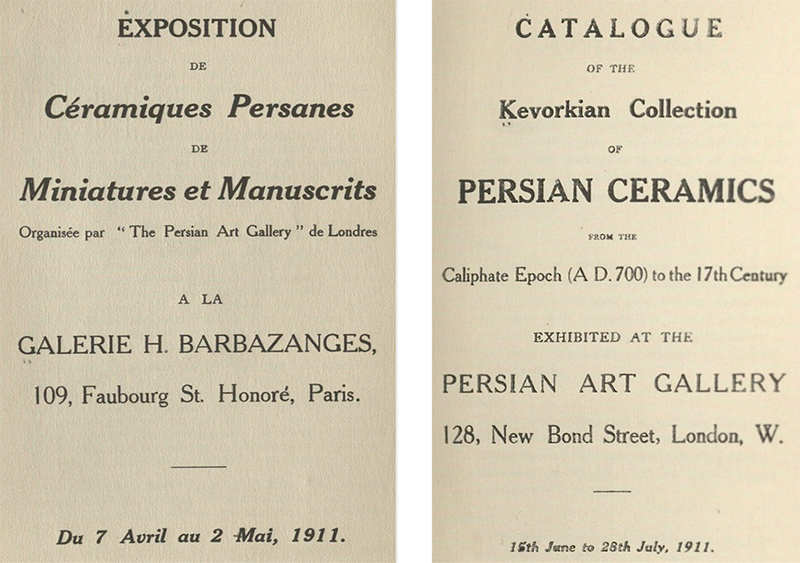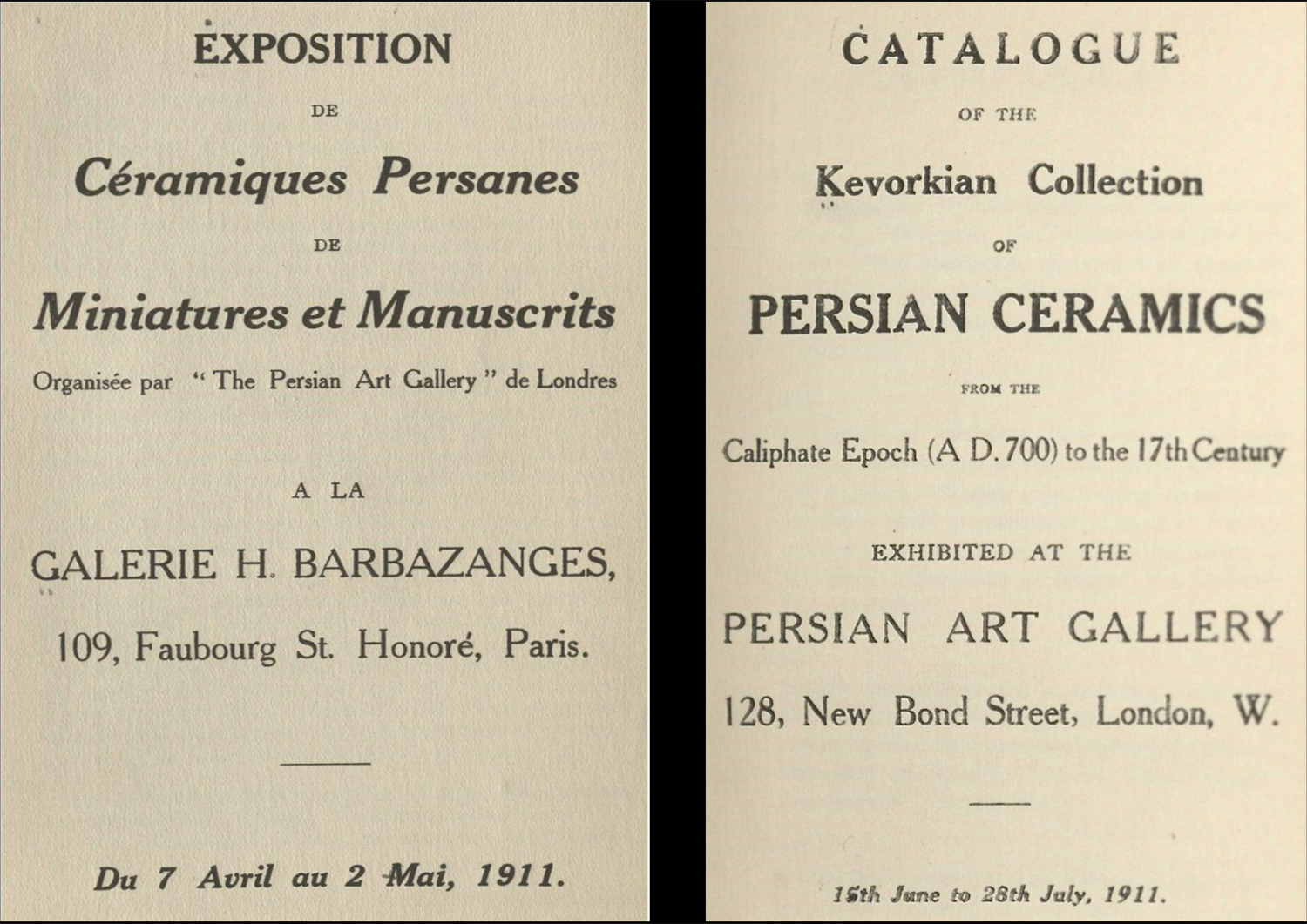 - The title page of the first catalogue indicates that the exhibition was organized by “The Persian Art Gallery” of London, which was indeed Kevorkian’s gallery. ↩