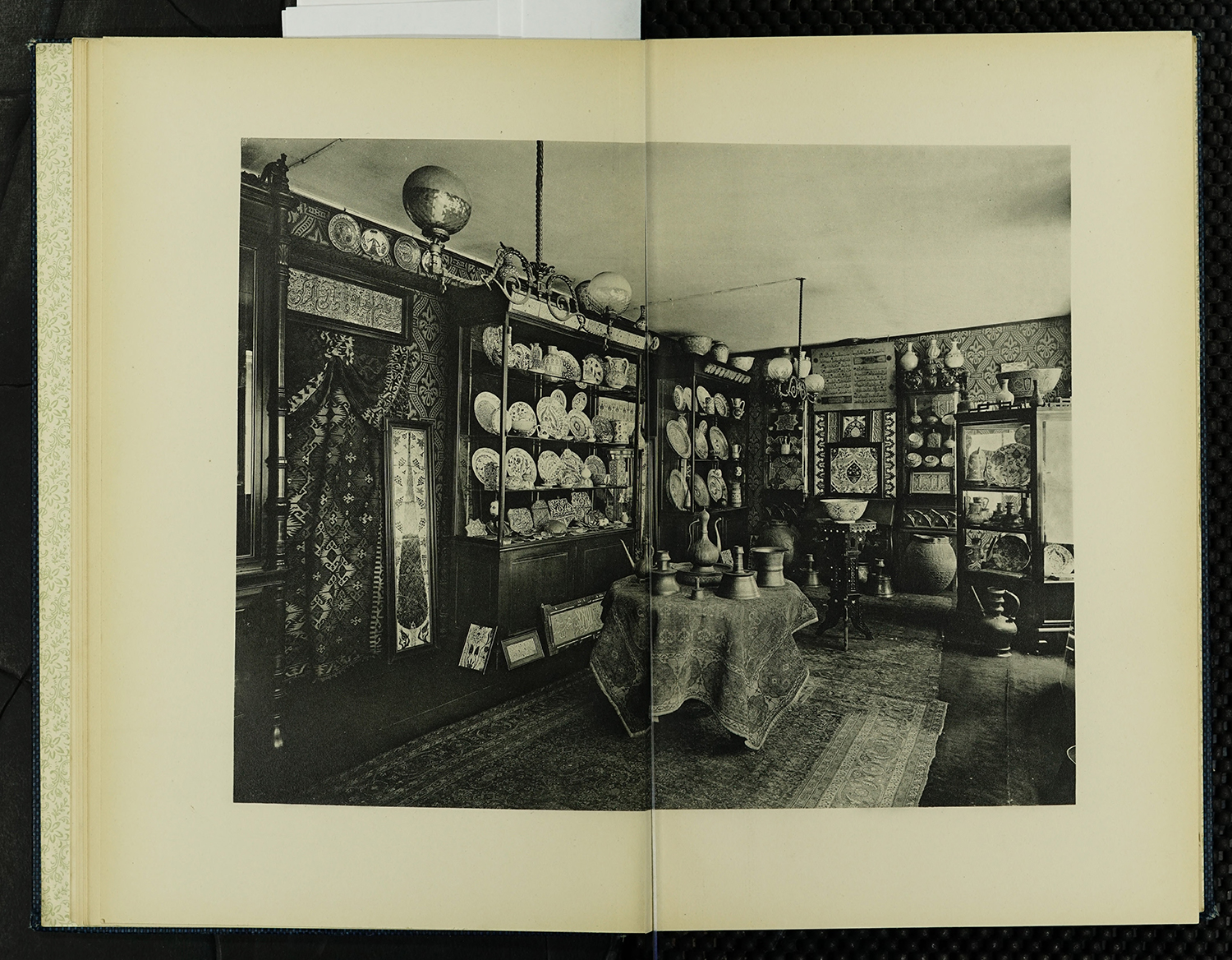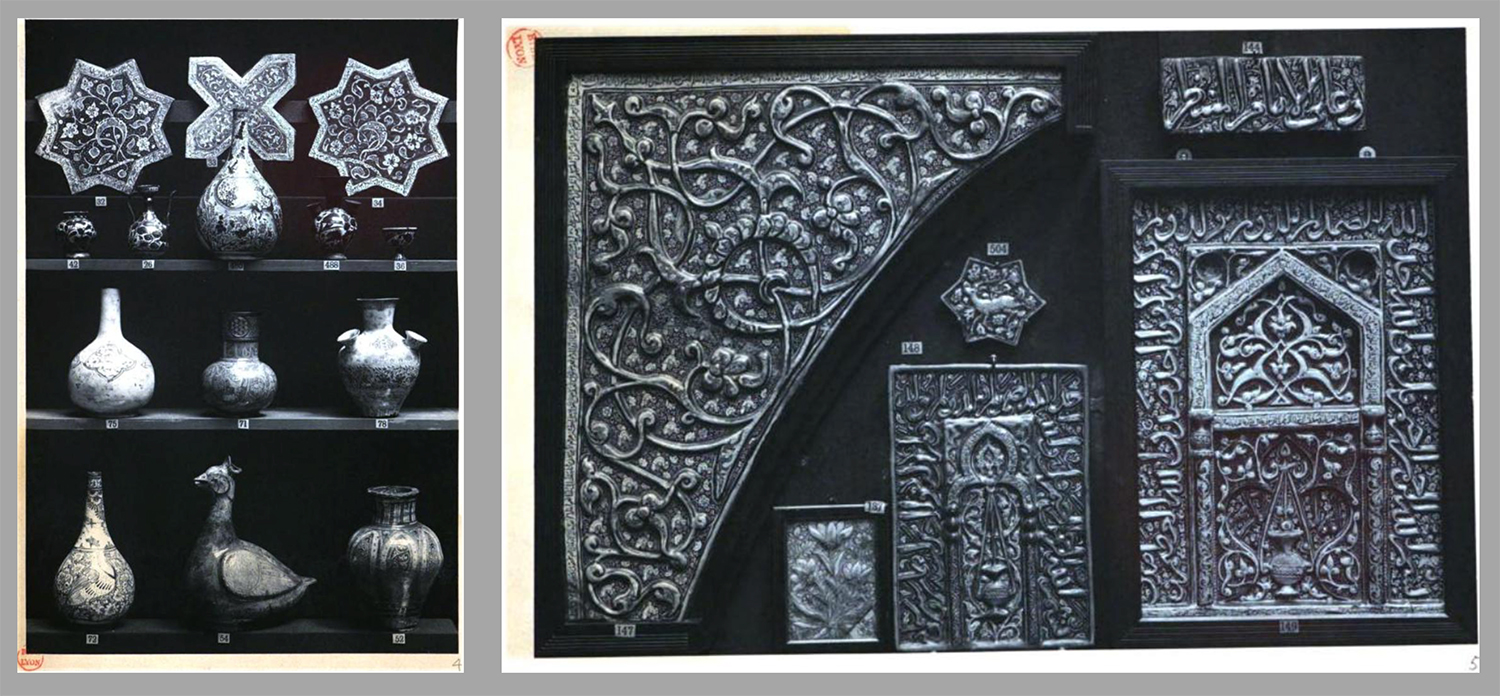 The exhibition catalogue is available by preorder to members of the club and includes over thirty photographic plates of ‘objects’ with their catalogue numbers. Many plates show materials densely packed on shelves and walls, and luster tiles are often mixed with vessels. Single tiles once part of multi-tiled mihrabs, rectangular cenotaphs, and long friezes are framed alone, some literally in wooden frames and hung on the wall like paintings. All architectural context is lost in favor of the collectible trophy signifying the gentleman collectors’ supposed taste.