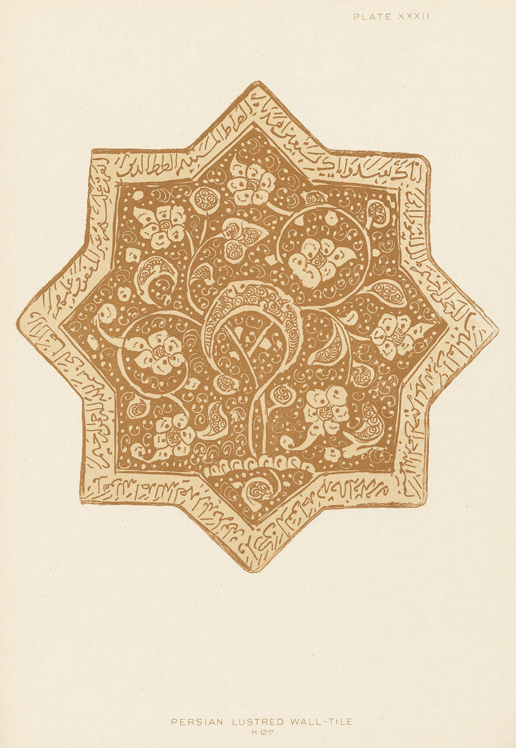 A four-month exhibition (18 March to 11 July) at the Burlington Fine Arts Club—a private gentleman’s club established in 1866 and located at 17 Saville Row in London (map)—is the first major exhibition of Persian art in Britain. The exhibition is spearheaded by English collector Charles Drury Edward Fortnum (d. 1899), has a high rate of visitation (4,198 visitors besides club members), and includes 606 loans from forty-one collectors, all of whom are members of the club and some of whom will become major figures in the collecting of Persian art.35 The exhibition includes a sizable number of Persian luster objects and tiles, including three tiles from the Emamzadeh Yahya’s dado, described simply as “Persian lustred wall tile” or “star tile” (fig. 31).36 The tiles are lent by English ornithologist and collector Frederick DuCane Godman (d. 1919) and praised by English painter Henry Wallis (d. 1916) for “the quality of the lustre and the severe grace of the designs.”37