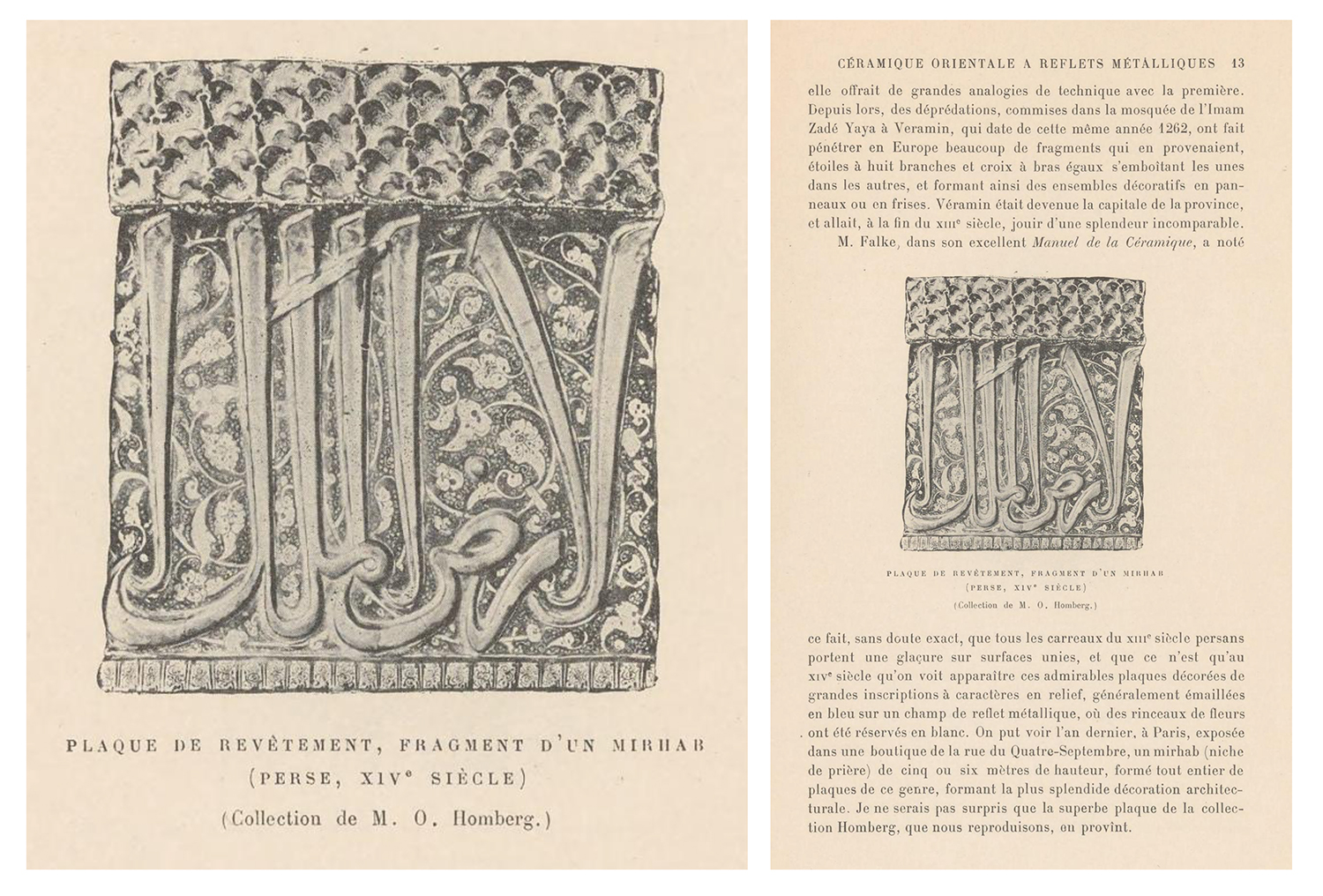 - Sarre, “Eine keramische Werkstatt von Kaschan im 13–14 Jahrhundert,” 65. Searches to date in the French national and diplomatic archives have not yet yielded any correspondence about the mihrab specifically. ↩