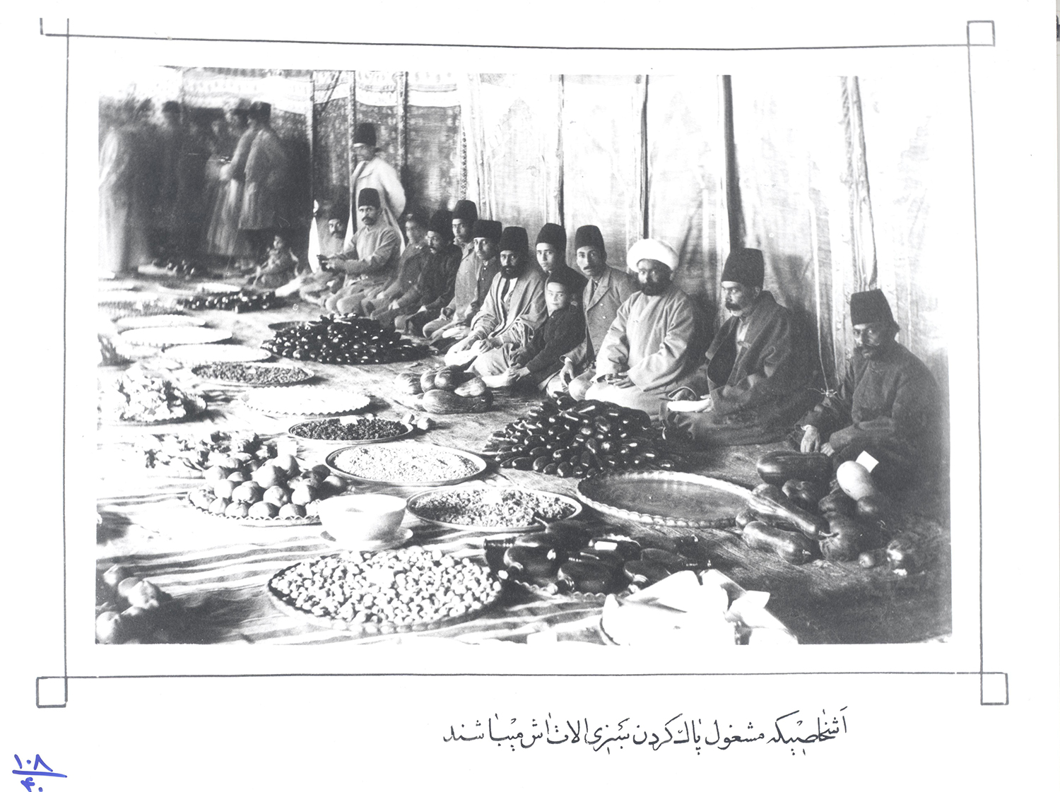 پنج عکس از این مراسم در دست است که مبتنی بر شباهت نقوش چادرها و زیرانداز و همچنین شکل ظروف و چیدمان اشیا همگی مراسم آشپزان سرخهحصار را در سال ۱۳۱۰ق. نشان میدهند. در تصاویر ۹ تا ۱۱ میتوان مواد اولیهی آش و مقدمات آمادهسازیاش را دید. تودههای بادمجان و کدو (حلوایی) در حواشی اتاق چیده شده و عدهای مشغول پوست کندنشاناند. انبوهی از مجمعهها و ظرفهای کوچکتر حاوی میوهها و احتمالاً حبوبات و ادویهها و دیگر ملزومات آش هم در میان اتاق ردیف شدهاند. روی ظرفها برچسبهایی به چشم میخورد که احتمالاً نام و نشان مواد درون ظرف رویشان ثبت شده است .در تصویر ۹ ناصرالدینشاه بالای مجلس، روی صندلی، نشسته است و گویی بر آمادهسازی مواد آش نظارت میکند. تصویر ۱۲ «عملهجات طرب و بازیگر» را در مراسم نشان میدهد، و در تصویر ۱۳ کاسههای آش دیده میشود که روی سفره و جلوی مهمانانی که دور آن نشستهاند چیده شده است. در این دو عکس، میتوان تصویری یافت از تفریحات و تشریفات این مراسم، همانچه این نذری را به نذری متمایزی بدل کرده و عدهای را نسبت به ریشههای مذهبی آن به تردید انداخته است.
